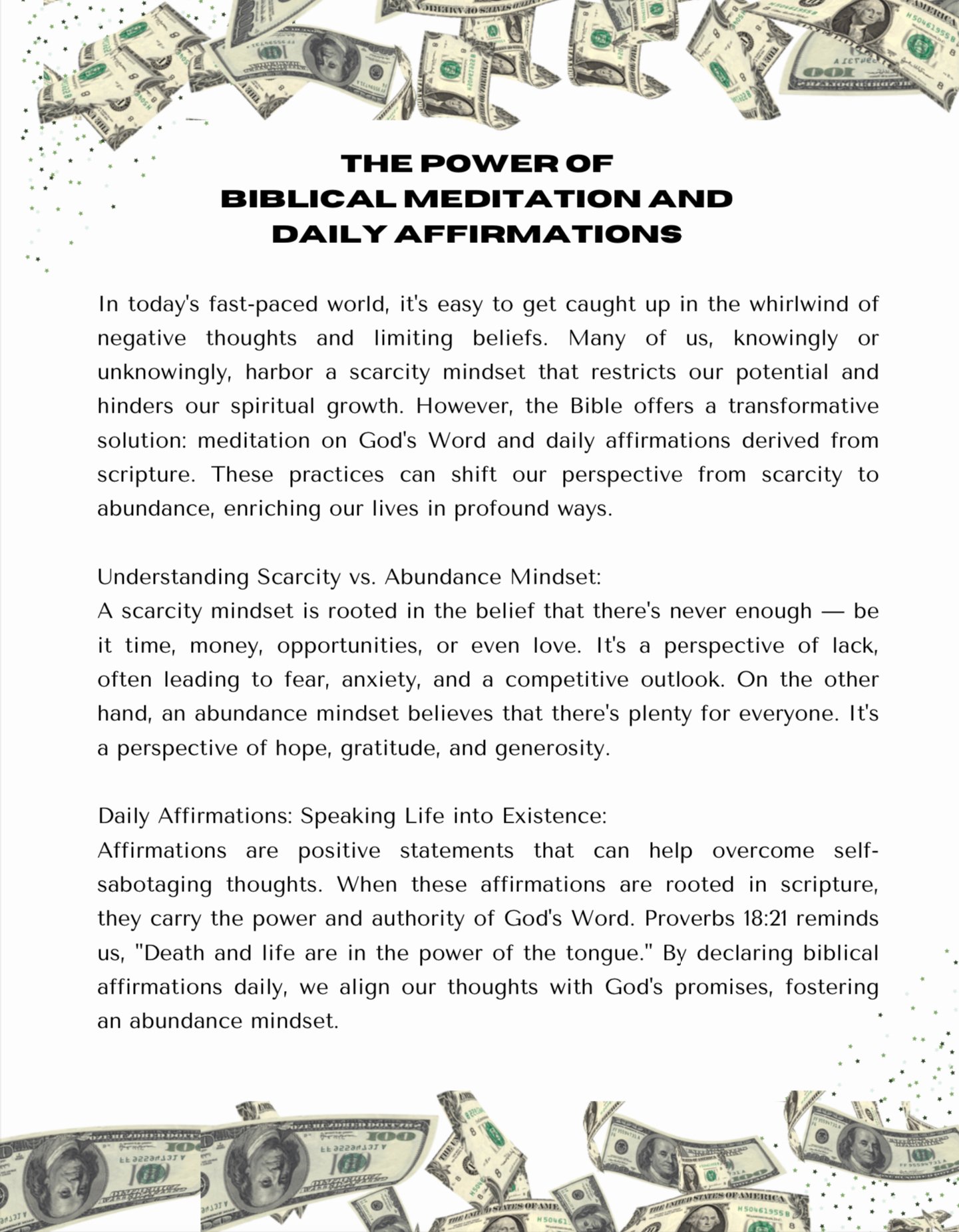 "7 Days of Bible Abundance" is a transformative eBook designed to guide you on a 7-day journey of spiritual and financial enlightenment. This book is crafted to help individuals cultivate an abundance mindset through the profound wisdom of the Bible, offering a unique blend of daily affirmations, prayers, and scriptures.