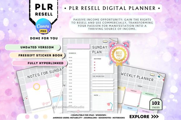 You’ll receive 102 PLR template pages — packed with trackers, lists, and note layouts — ideal for anyone looking to create, brand, and sell digital planners for reliable passive income.