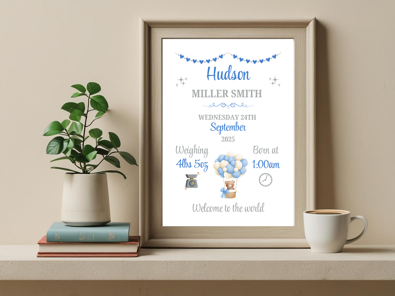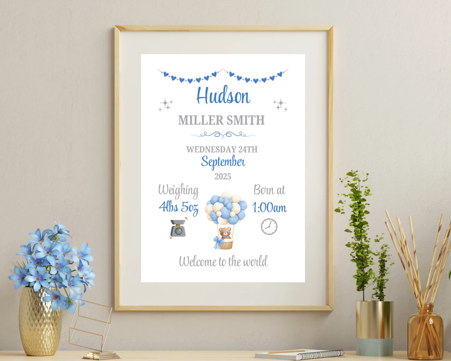 Personalized Baby Birth Announcement Print | Digital A4 Newborn Stats Poster | Blue Teddy Balloon Nursery Wall Art | Instant Download