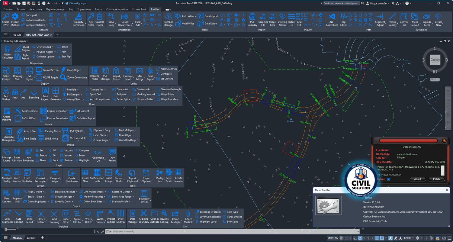 🤖 Carlson (ex. DotSoft) ToolPac v25.0.1.0 (Build Date: 2nd Jan, 2026) is a productivity add-on suite for AutoCAD-based civil/land surveying workflows, commonly used to speed up drafting, surface/terrain tasks, and coordinate geometry (COGO) style operations through specialized commands and utilities. It’s typically aimed at surveyors, civil designers, and CAD technicians who produce plan sets, parcels, alignments, and field-to-finish deliverables inside an AutoCAD environment.