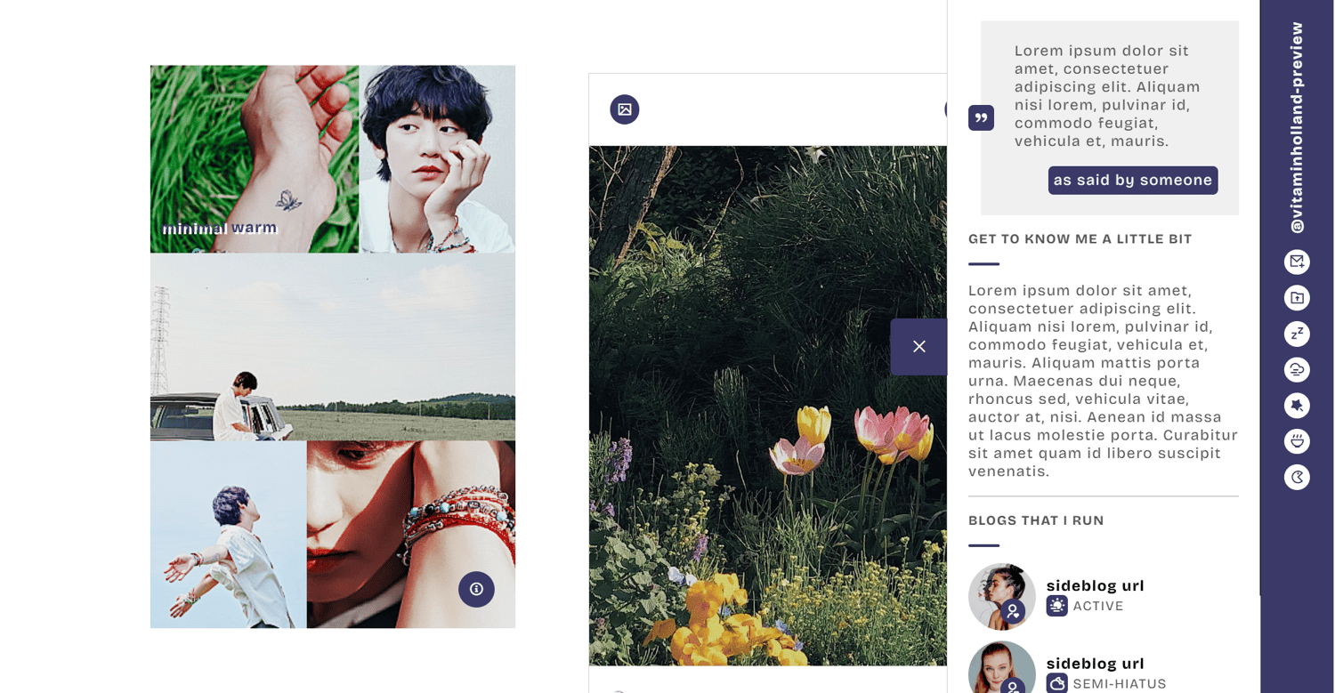 two 200x180px sidebar images, two 150x180px sidebar images, one 350x180px sidebar image, blog title, blog subtitle, five custom links, search bar, about quote section, about section, sideblogs section, 450px to 540px text posts
