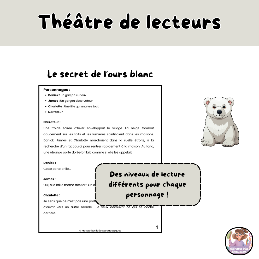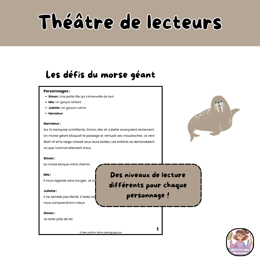 Ces théâtres de lecteurs permettent aux élèves de 2e cycle de participer a ctivement à la lecture, en alternant les rôles entre les personnages. C’est un contexte concret et ludique pour travailler la fluidité en lecture. Les documents peuvent être utilisés avec des élèves de niveaux scolaires variés selon leur habileté en lecture et en fonction de l’intention pédagogique recherchée. Ce matériel peut donc être utilisé dans divers contextes (classe, orthopédagogie). Vous trouverez 6 histoires sous le thème des animaux polaires et comprenant chacune trois personnages ainsi qu’un narrateur :