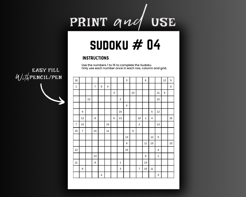 Challenge your problem-solving skills with this expert-level 16x16 Sudoku puzzle book! Designed for smart minds seeking an advanced mental workout, these puzzles provide hours of stimulating entertainment. This printable PDF includes a collection of expertly crafted Sudoku puzzles with solutions for easy reference. Perfect for puzzle enthusiasts who love to push their limits, this instant download is convenient and ready to print at home.