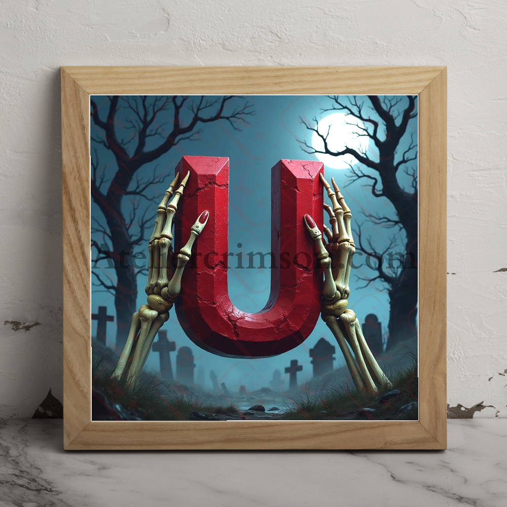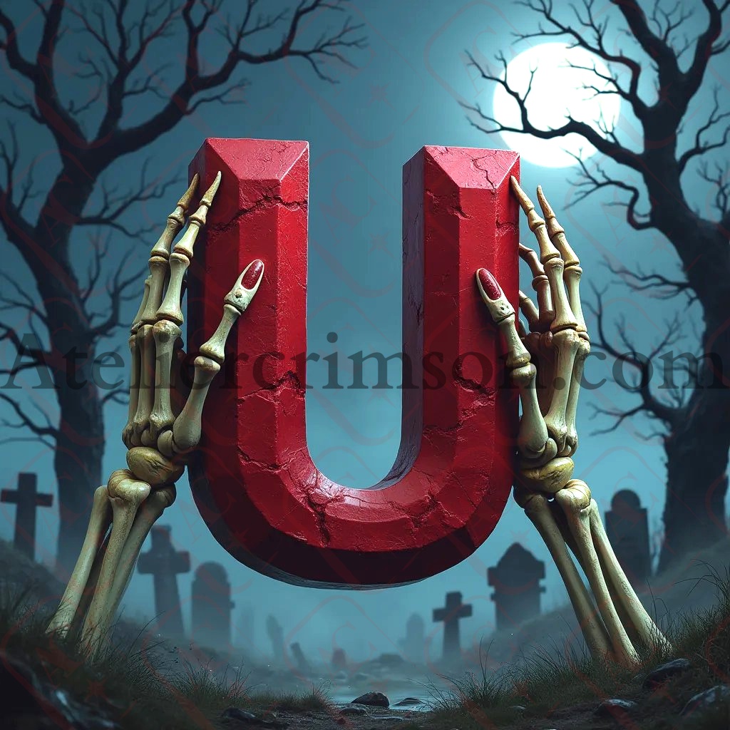 The letter U ruby halloween skull Discover our eerie alphabet series featuring photorealistic ruby letters and numbers. Each character, crafted from deep red gemstone, floats mysteriously in a misty graveyard. Skeletal hands frame these gleaming symbols against a moonlit, Halloween-inspired backdrop. Perfect for gothic design projects or seasonal decor inspiration!