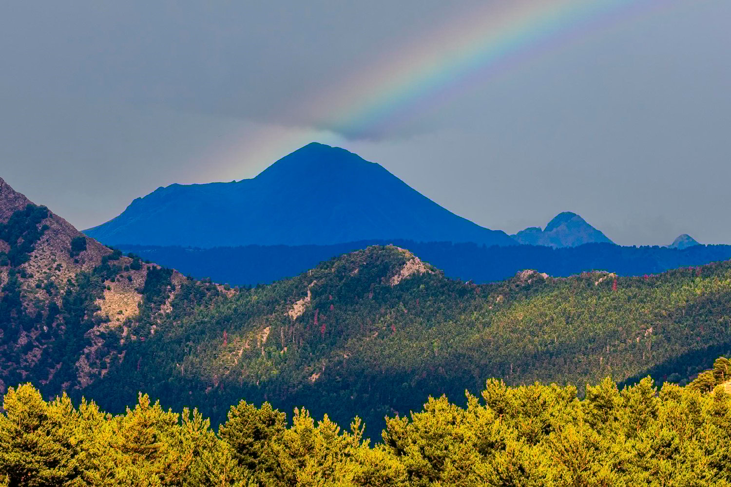 A vibrant rainbow arcs over a tranquil mountainous landscape, with lush green trees in the foreground. The sky provides a moody backdrop as the rainbow adds a splash of color.