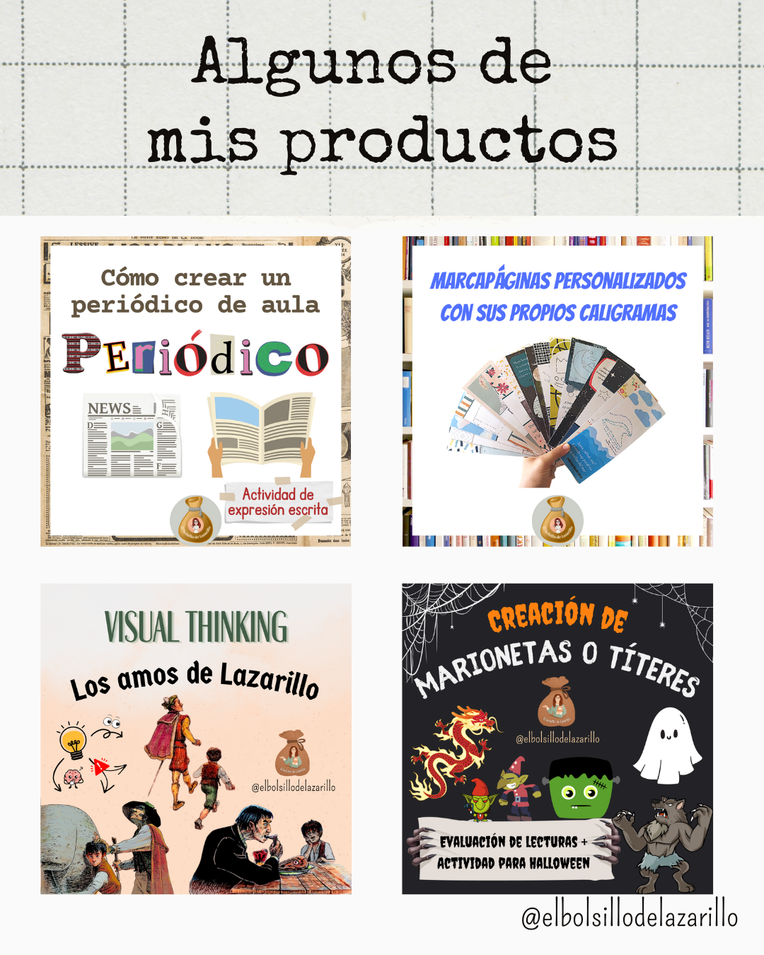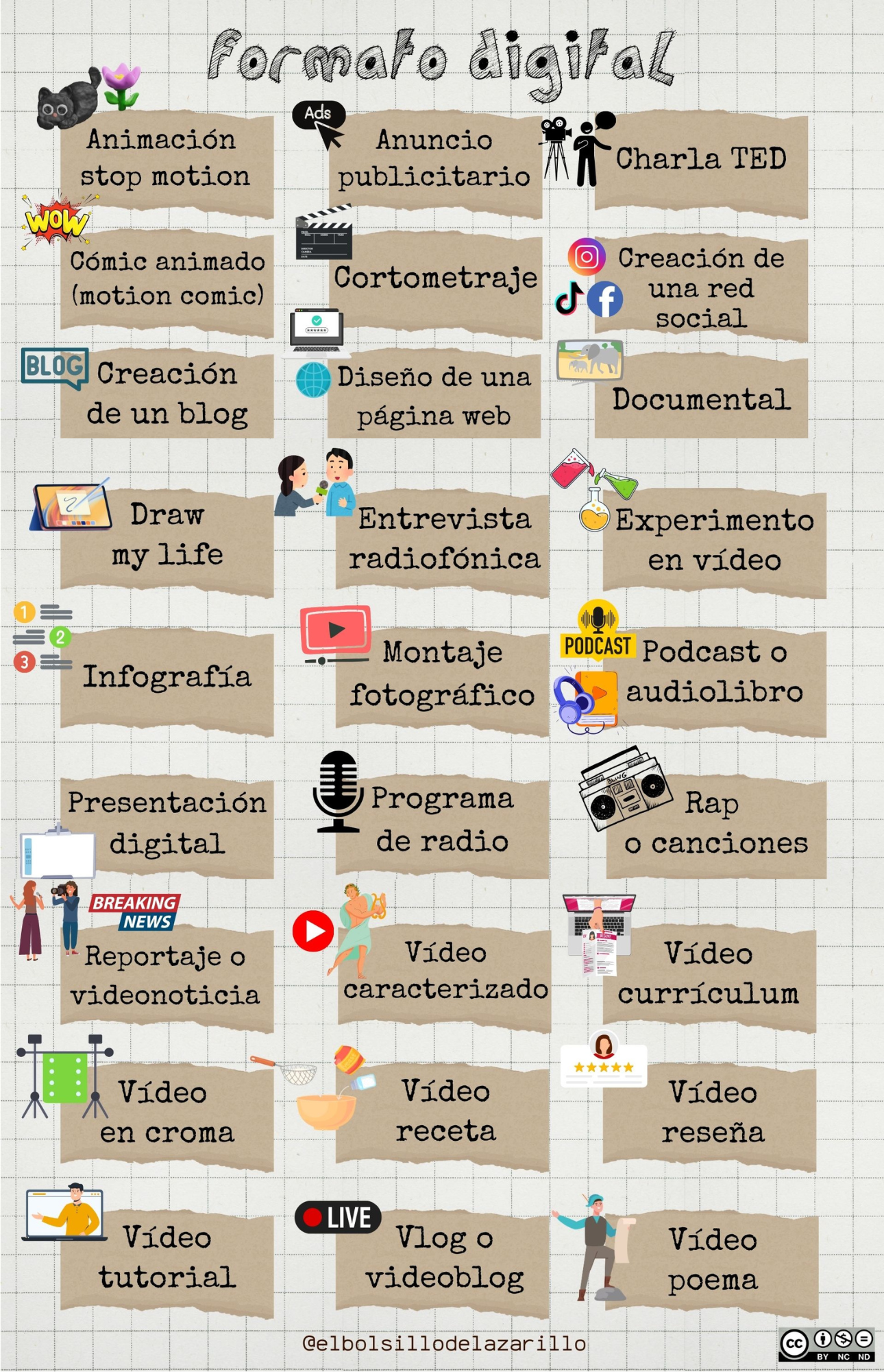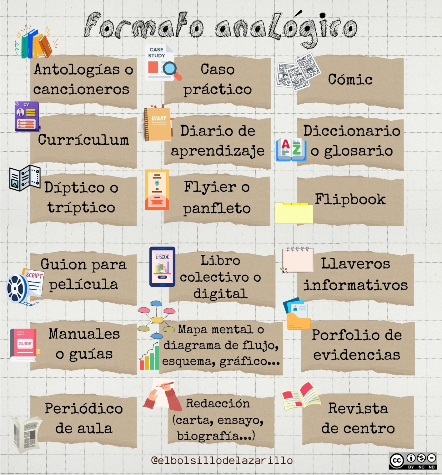 Para la recopilación de productos, he buscado inspiración y referencias en diferentes fuentes de información, especialmente en el post sobre productos finales de @abcdeele, así como en las páginas web de @orientacionandujar y @docentesaldiablog, en unas entradas específicas sobre este tema (fuentes citadas en la webrafía).