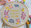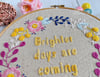 A lovely wreath with flowers and leaves surround the hopeful lettering: Brighter Days Are Coming.