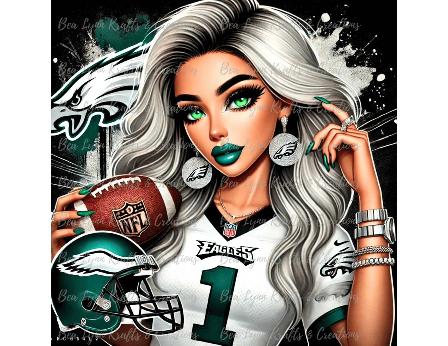- Striking Philadelphia Eagles-themed artwork featuring a fashionable female fan.