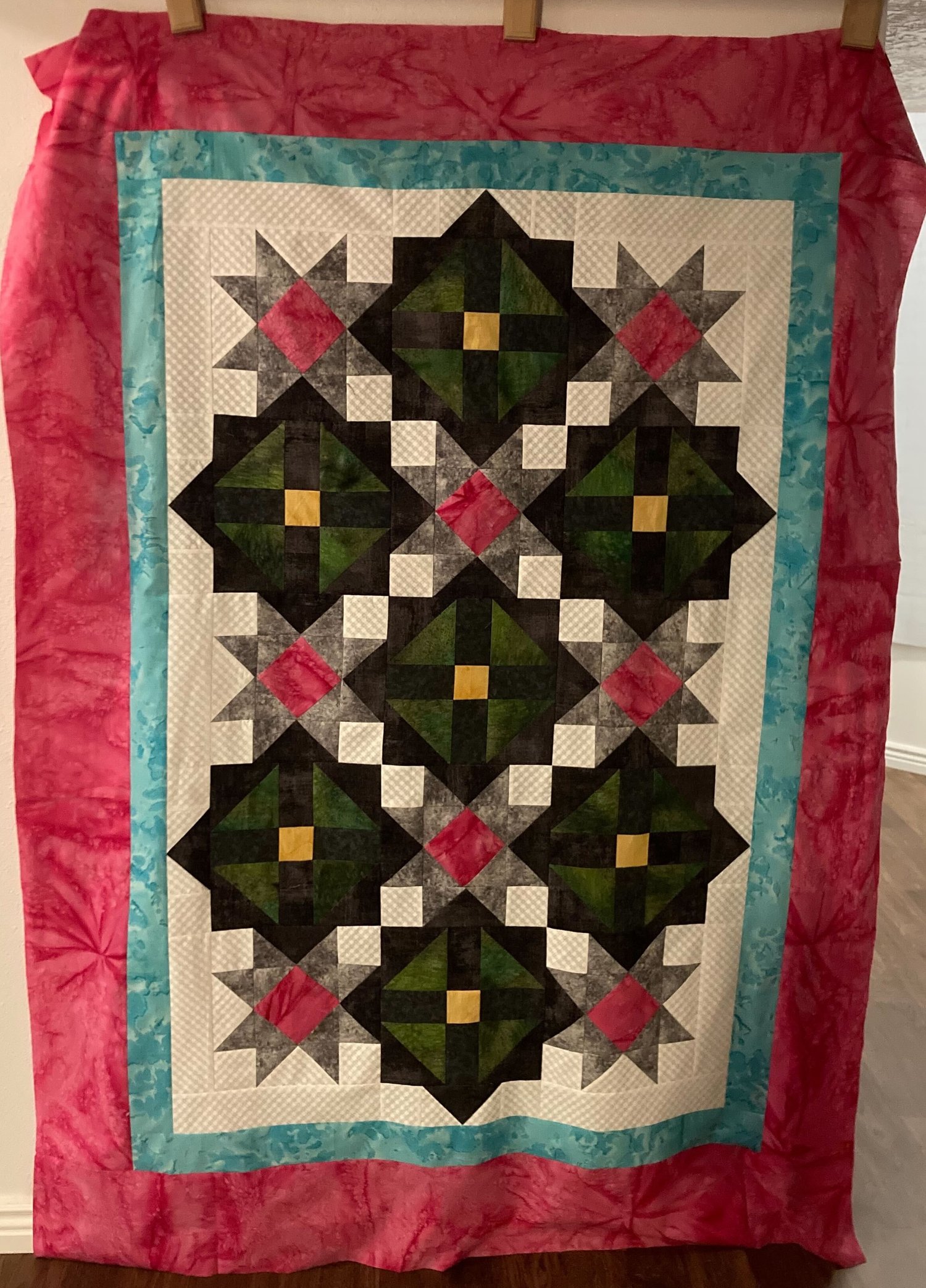 Combine two different blocks for an interesting look. Change up the fabrics to change the look you end up with. I use Deb Tucker's Studio 180 Design® Wing Clipper 1 and Tucker Trimmer 1®, but I give instructions how to make the blocks without the rulers. You can use a border print for a mitered border, or two fabrics for straight borders, instructions are included for both ways.