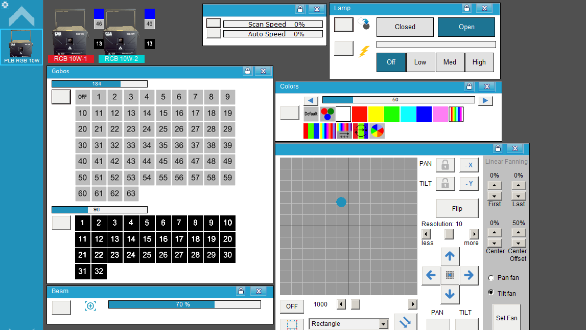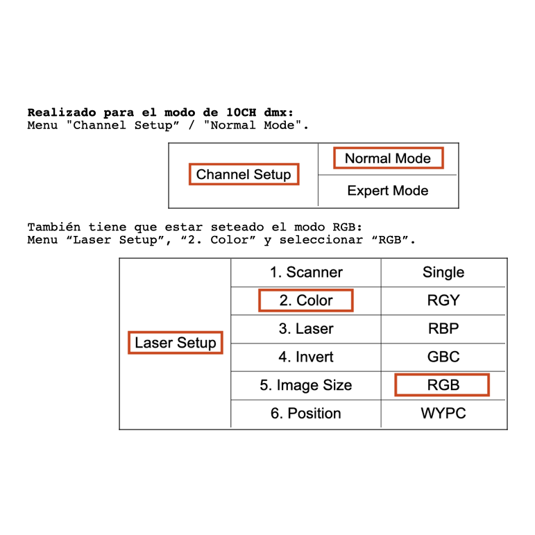 - Realizado para el modo "Channel Setup / Normal Mode", que es de 10CH y para el modo RGB: "Laser Setup / 2. Color / RGB".