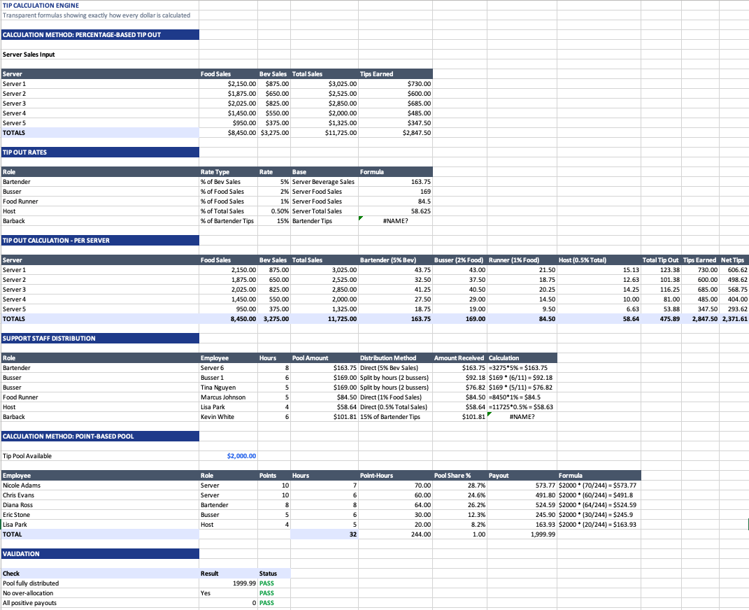 Restaurant Tip Pool Calculator - Tip Out Distribution, Point System, State Compliance and Weekly Payout Sheet