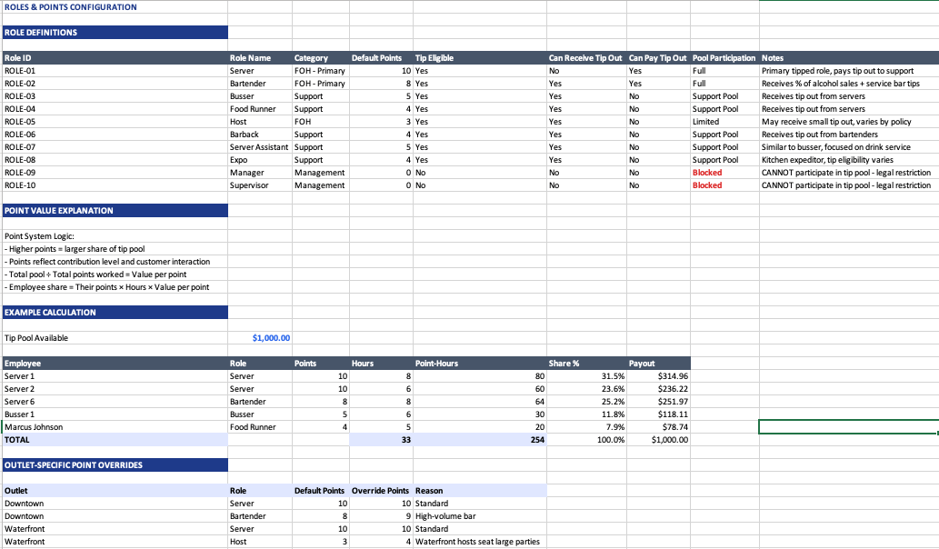 This 20-sheet system handles point-based tip out, references state law for compliance, generates weekly payout sheets with signature lines, and creates a full audit trail. Works for full service restaurants, hotel food and beverage, bars, and multi-outlet operations.