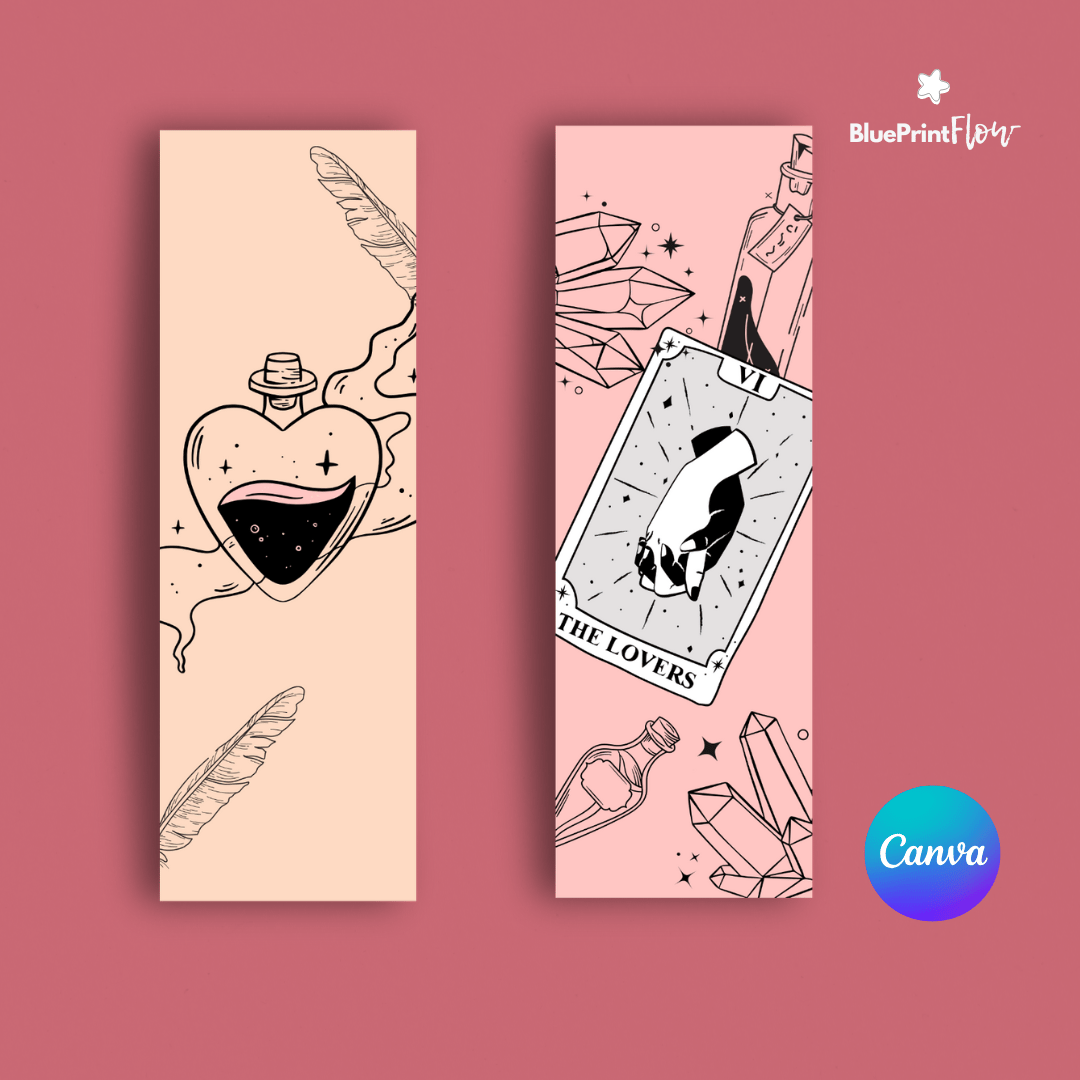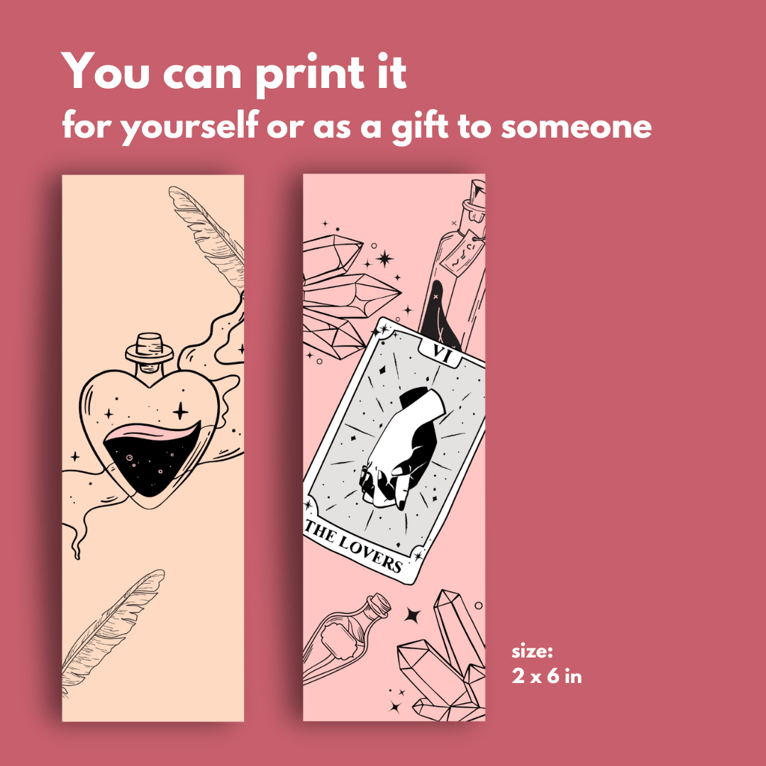 These two minimalist bookmarks are perfect for any book lover with a touch of magic in their heart. Designed with a "witchy" aesthetic, they feature a heart-shaped potion bottle and the classic "The Lovers" tarot card, making them ideal for both personal use and gifting.