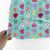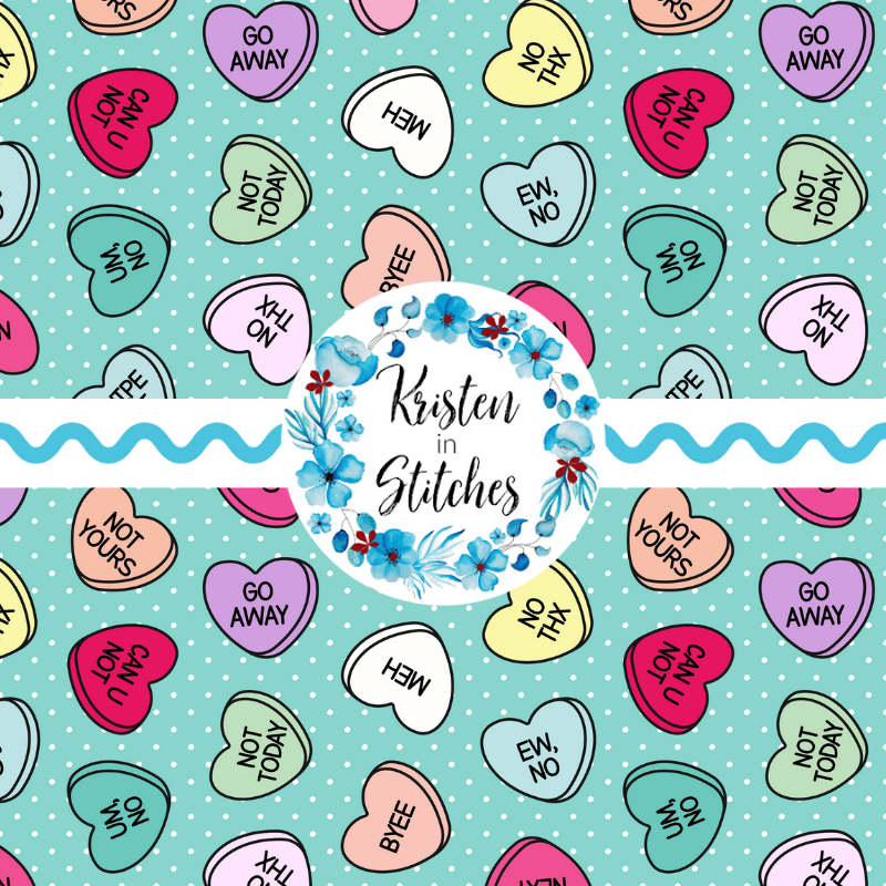 An anti-valentine conversation heart candy pattern, on aqua blue.