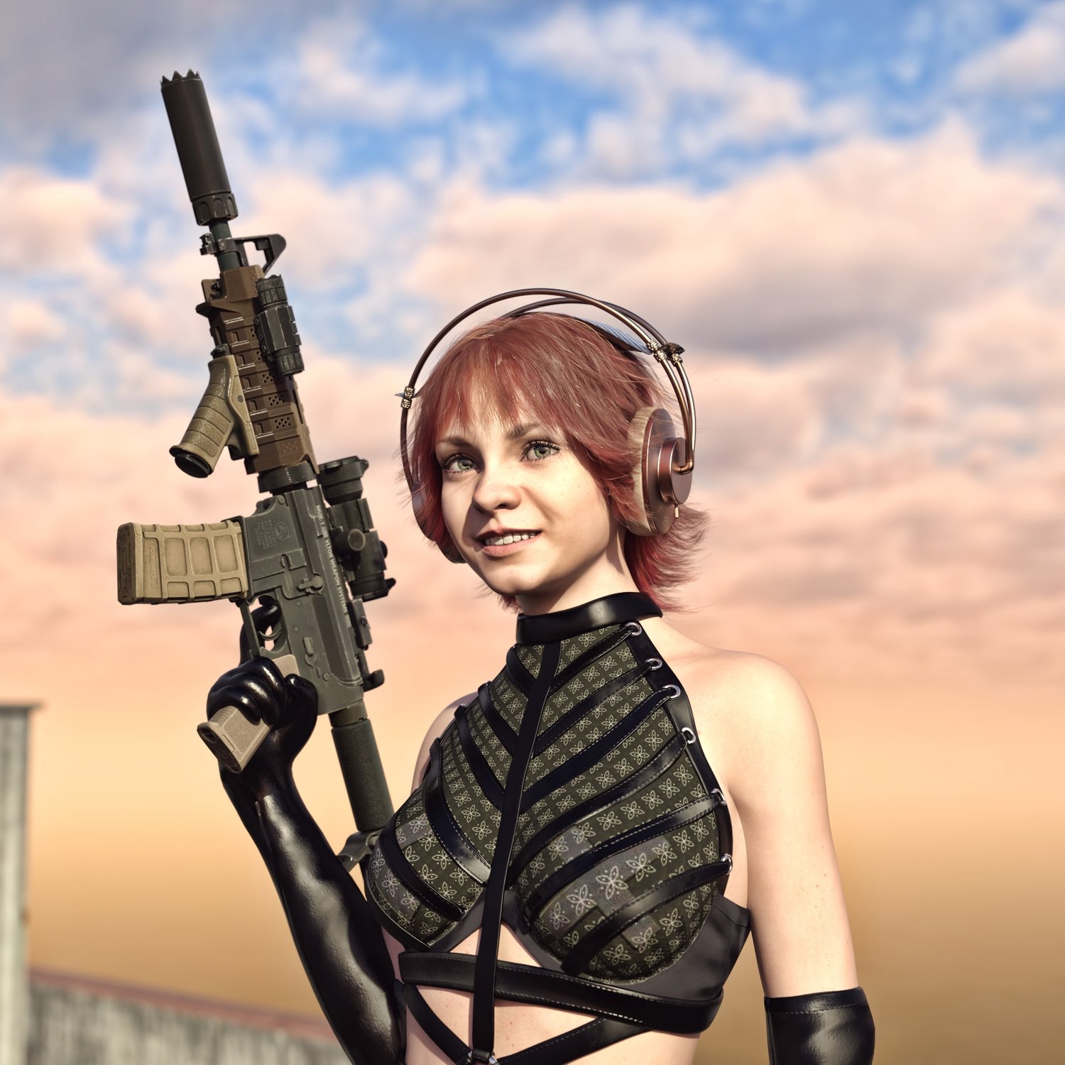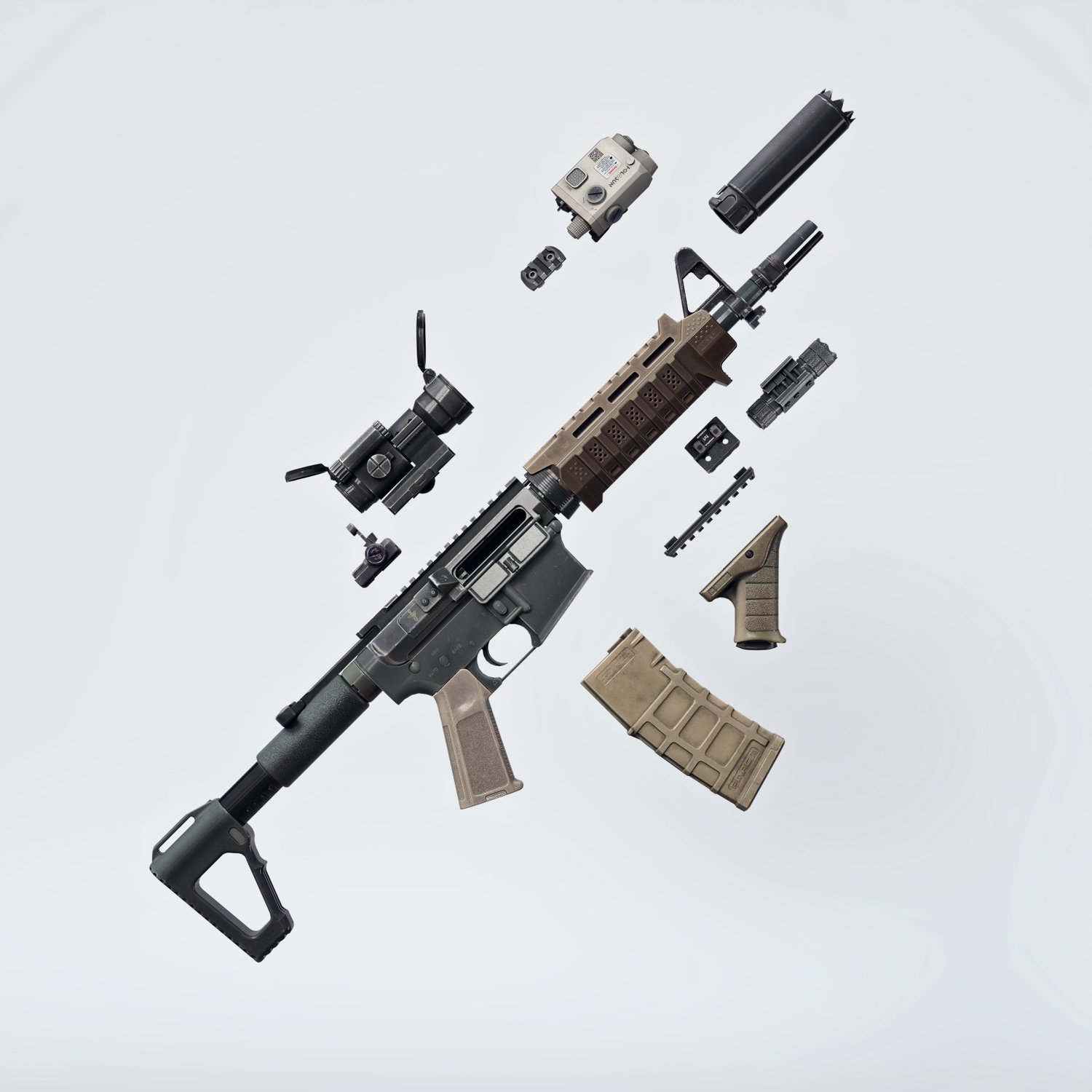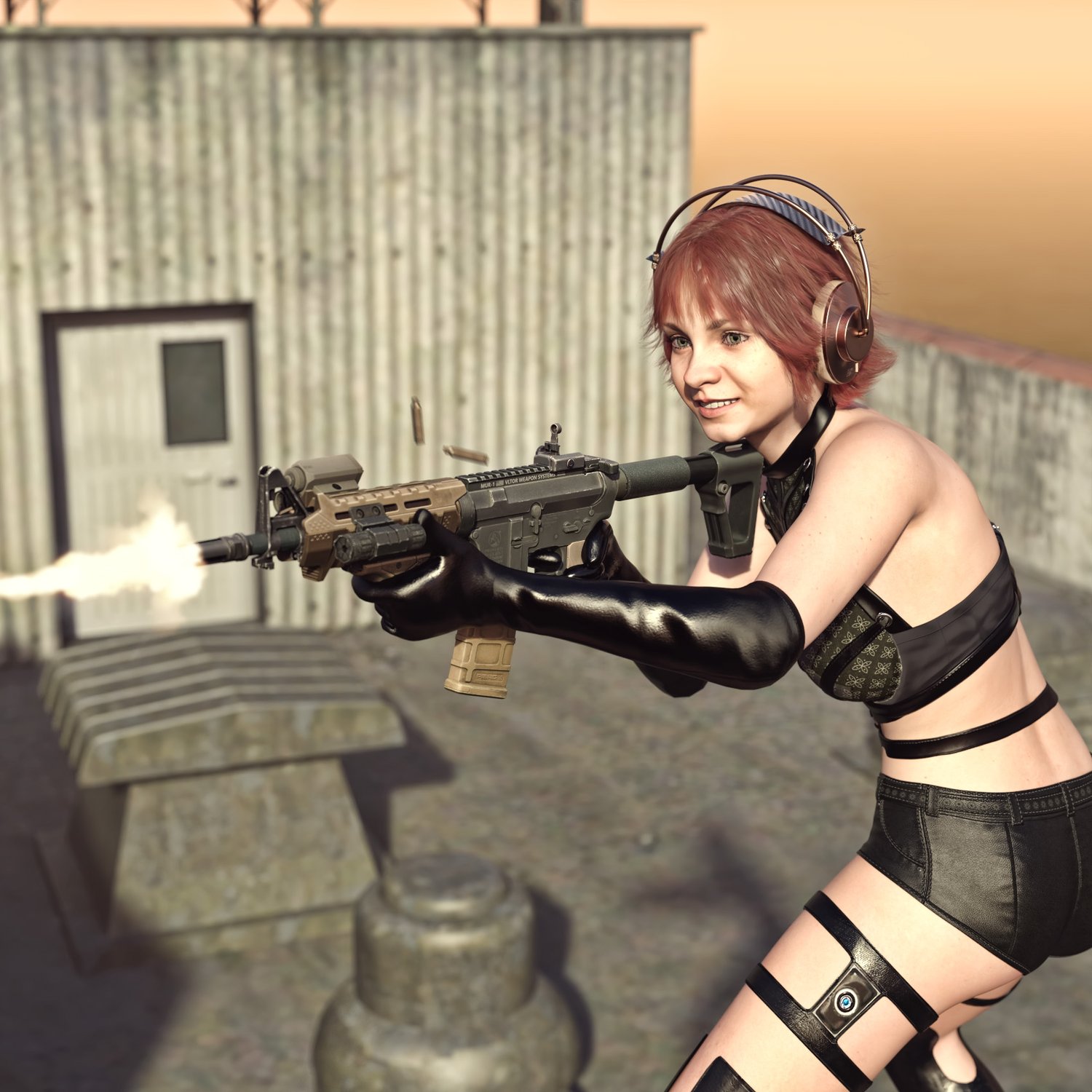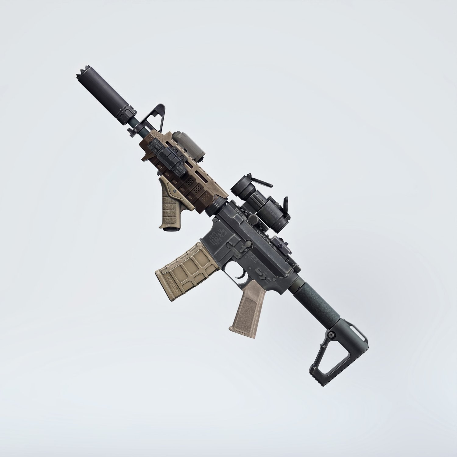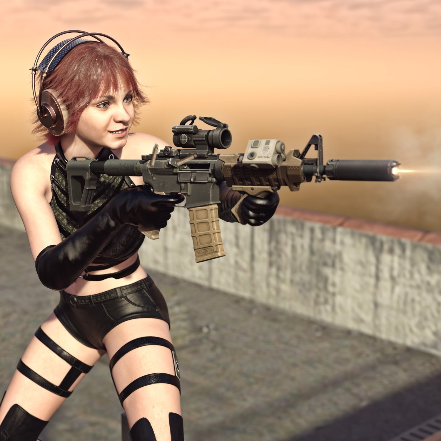 A cool variant of M4 rifle with some nice accessories to customize. Includes a silencer, optic sight, a laser, light and some other small bits. Trigger, stock, safety, bolt, bolt cover etc also rigged for more realistic pictures. The prop is converted and rigged for use in DAZ.
