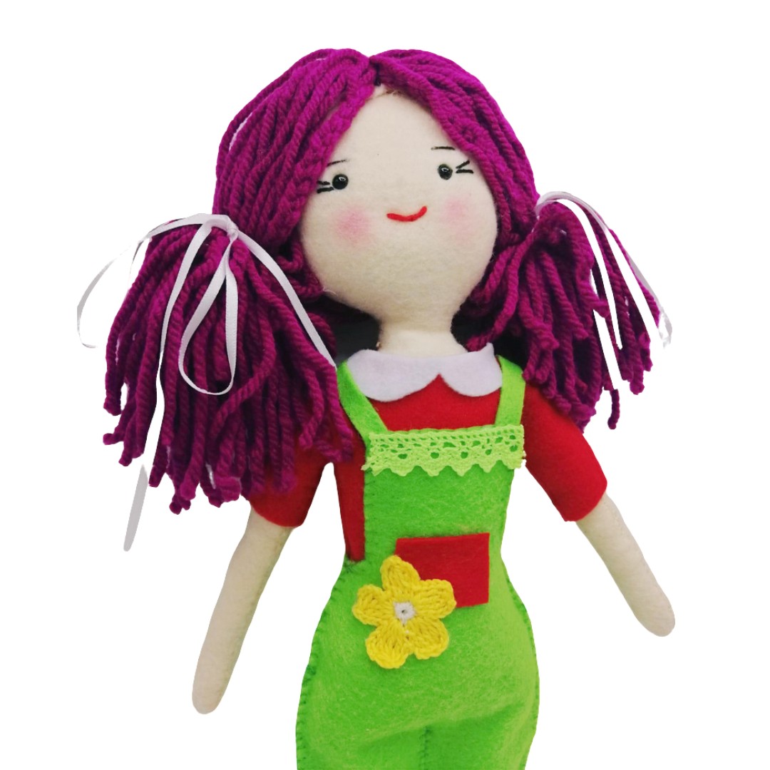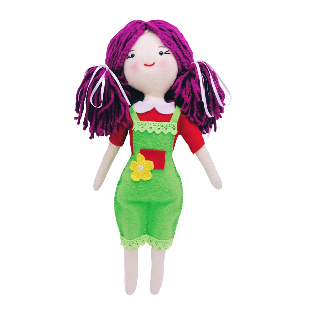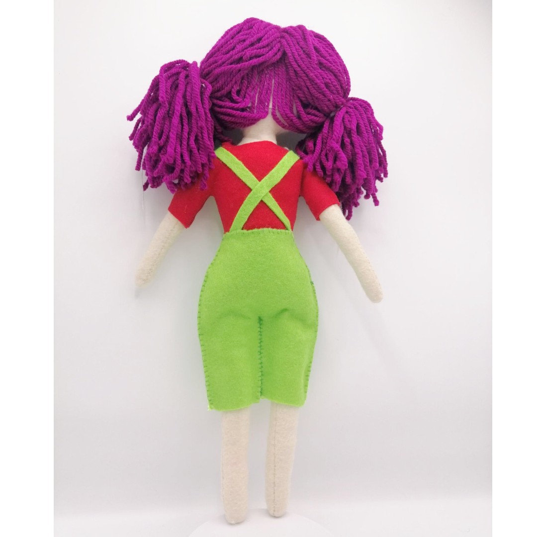 Papusa cu par lung violet, cu salopeta verde si tricou rosu, din fetru