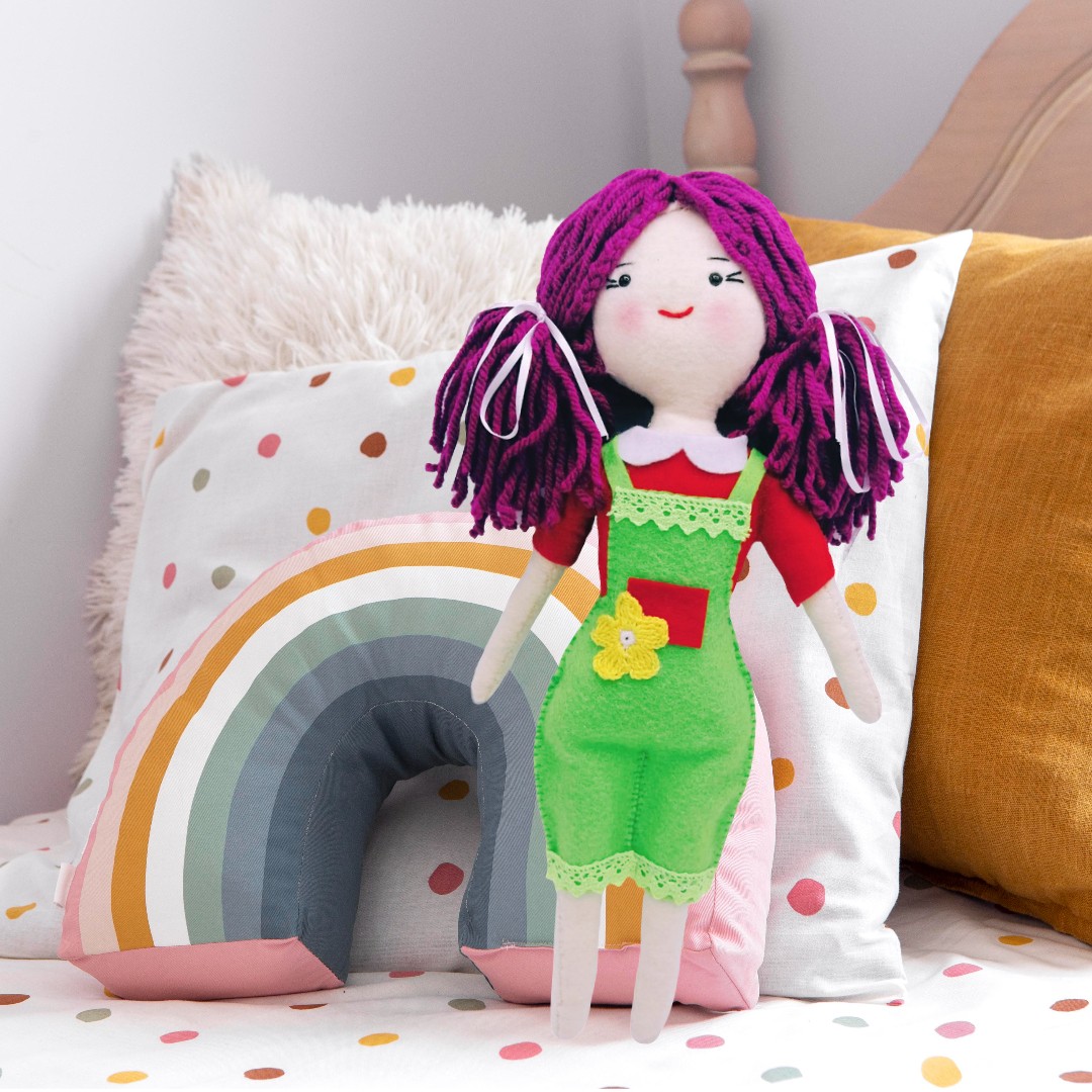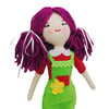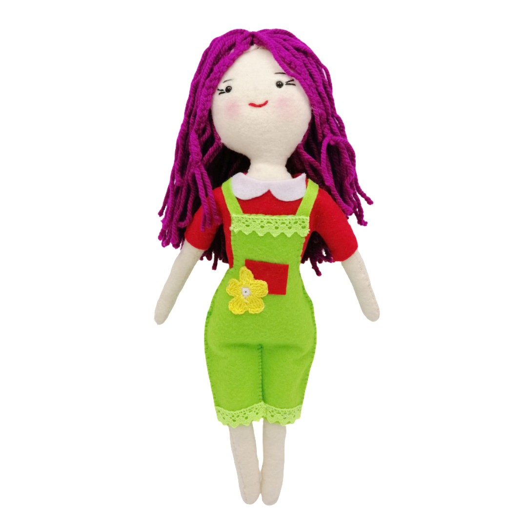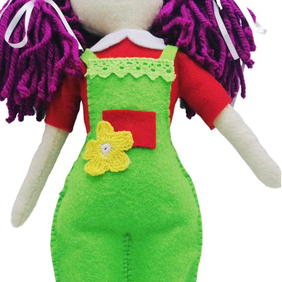 Papusa cu par lung violet, cu salopeta verde si tricou rosu, din fetru