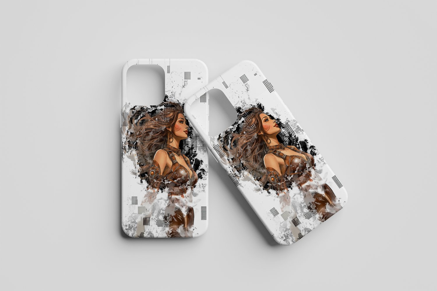 Steampunk-inspired striking digital artwork. The focal point is a profile portrait of a woman with flowing brown hair that seems to dissolve into an abstract swirl of black, white, and gray tones. Her face is adorned with subtle, geometric patterns, enhancing her otherworldly beauty.