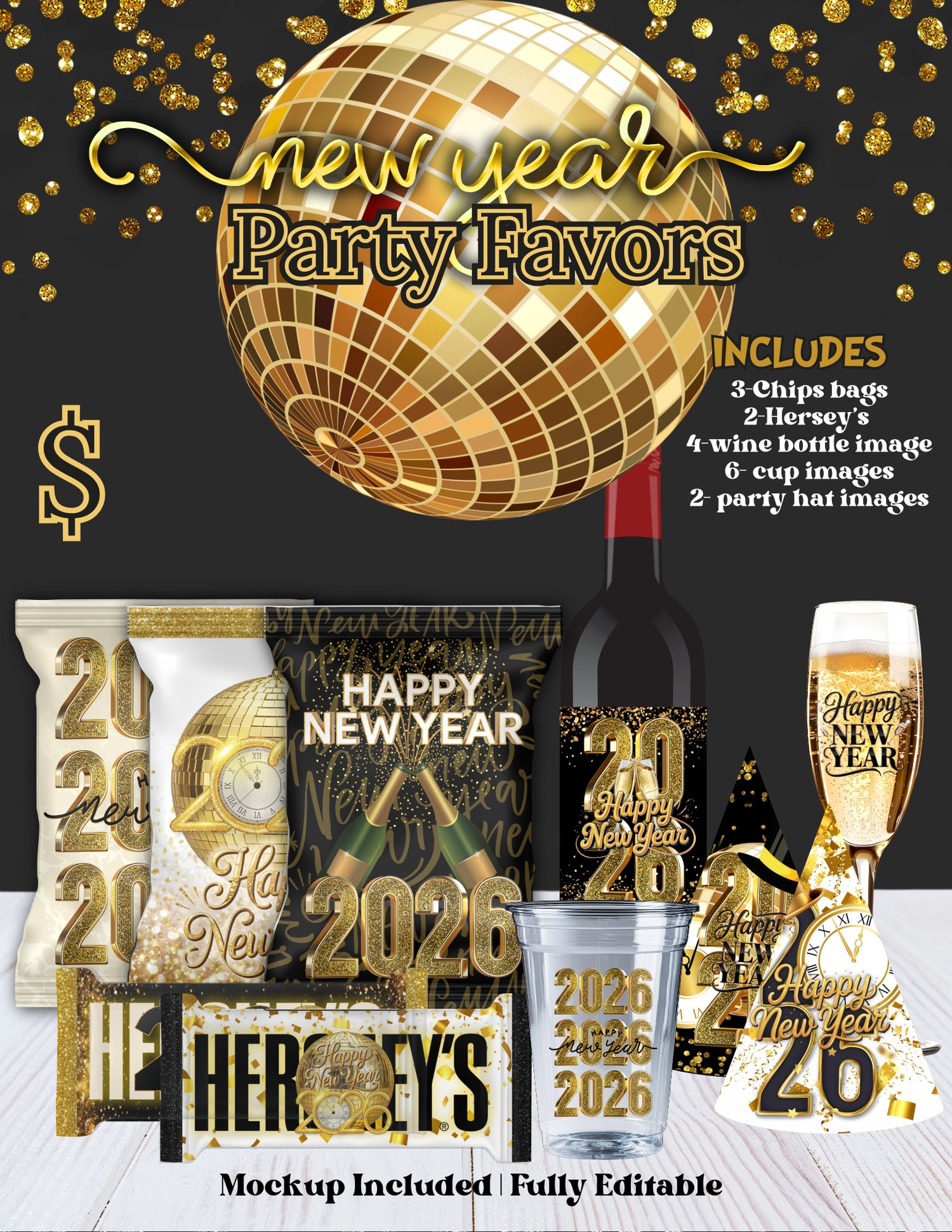 Ring in the new year in style with this glam New Year Treat Template Bundle, designed with elegant gold tones, disco ball vibes, and bold 2026 details. This bundle is perfect for New Year’s Eve parties, vendor events, gift baskets, or celebratory treats.