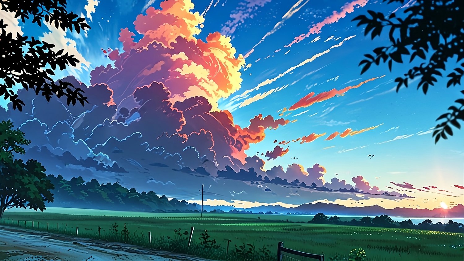 This image is a stunning anime-style landscape featuring a vibrant and expansive sky filled with dramatic clouds. The scene is set during either sunrise or sunset, as the clouds are painted in warm hues of orange, pink, and purple, contrasted by the cooler blues of the sky. The clouds are large and billowing, with streaks of light breaking through, creating a dynamic and ethereal atmosphere.