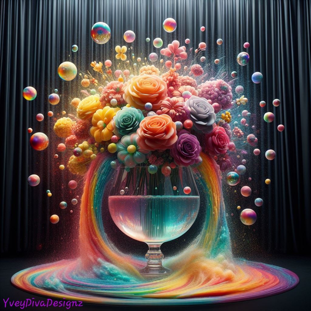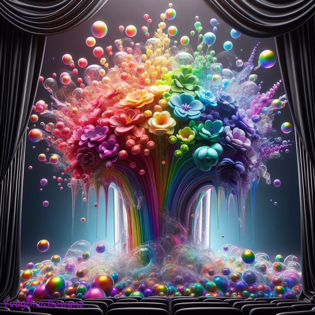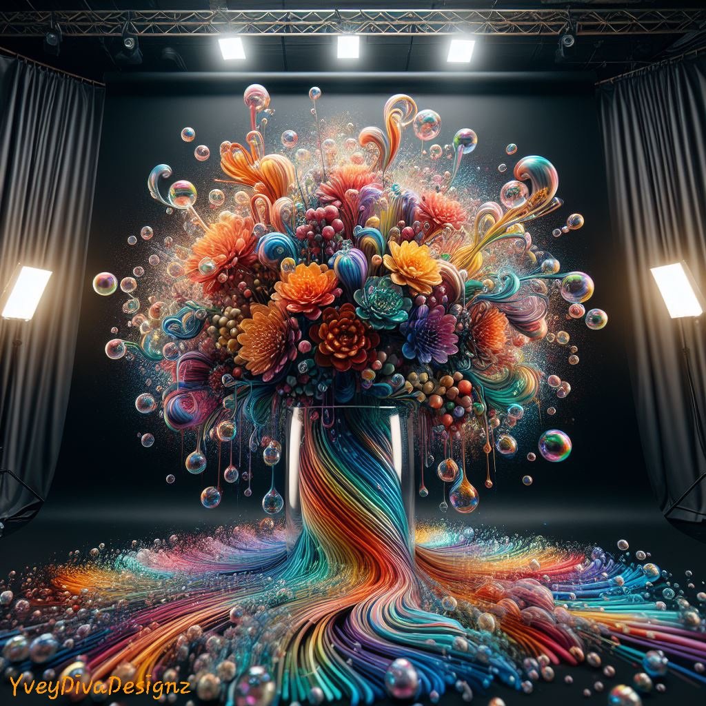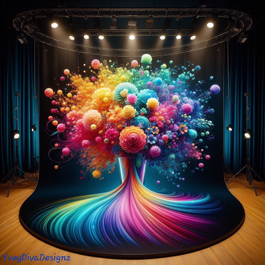Radiant Reverie depicts a vibrant bouquet of flowers, bursting with a rainbow of colors, set against the backdrop of a stage illuminated by dazzling stage lighting. The flowers appear to dance in the spotlight, their petals aglow with a radiant energy that captivates the viewer's imagination.