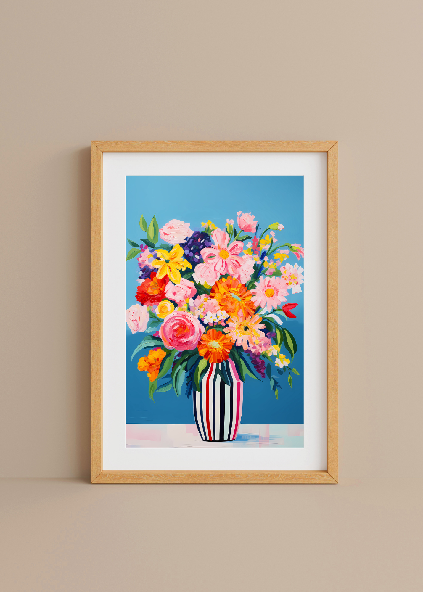 Confetti in Bloom— Colorful and bold, this bouquet lives in a striped vase that makes just as much of a statement as the blooms above it. Vivid orange, hot pink, cherry red, and lemon-yellow petals spill outward with unbridled enthusiasm. It’s cheerful, punchy, and full of energy—like a bouquet that walked out of a modern art dream. This print is for those who embrace color like confetti and believe in the beauty of the bold.
