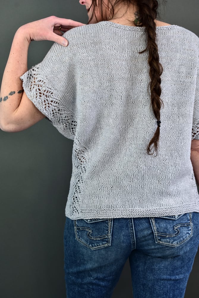 The Upper Back is worked flat with increases to shape the neck and short rows to shape the shoulders. The Upper Front is worked next, also with increases to shape the neck and short rows to shape the shoulders. The Upper Back and Upper Front are joined at the underarms, then the Lower Body is worked in the round to the hem with decreases to make the dolman shaping. The vertical lace panels are both charted and written.