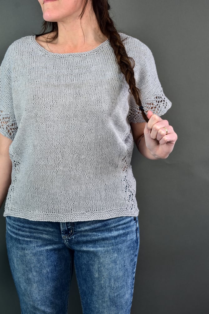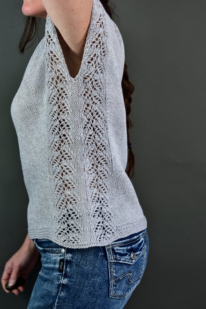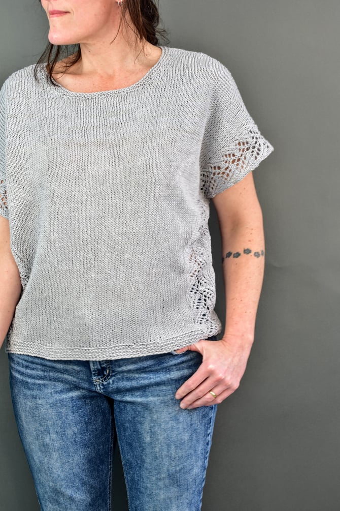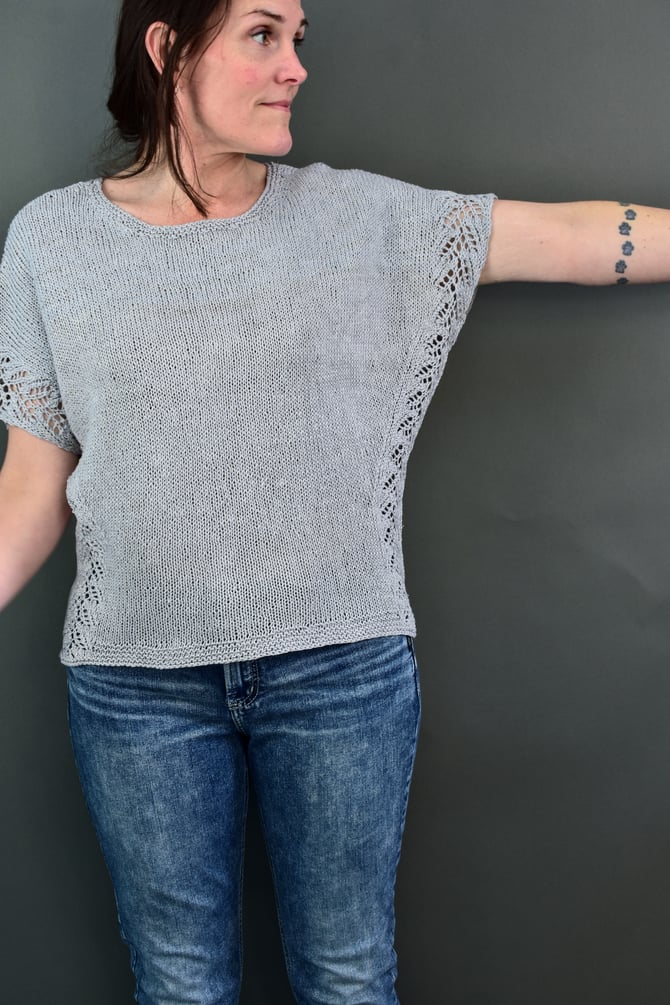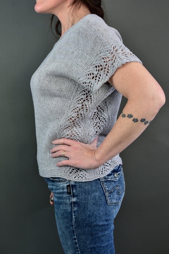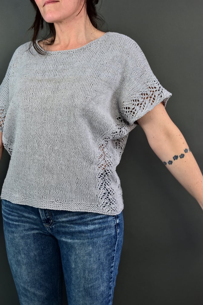 A summer tee that I want to wear all summer long! It covers my arms, lets my underarms breathe, and has a beautiful accentuating shape given by the side lace panels. The tee boasts a dolman shape for some wonderful airiness under your arms and arm coverage for those days when you really don’t want to show them. To balance the dolman shaping, the lower body is meant to have less ease and fit a bit more close to skin.