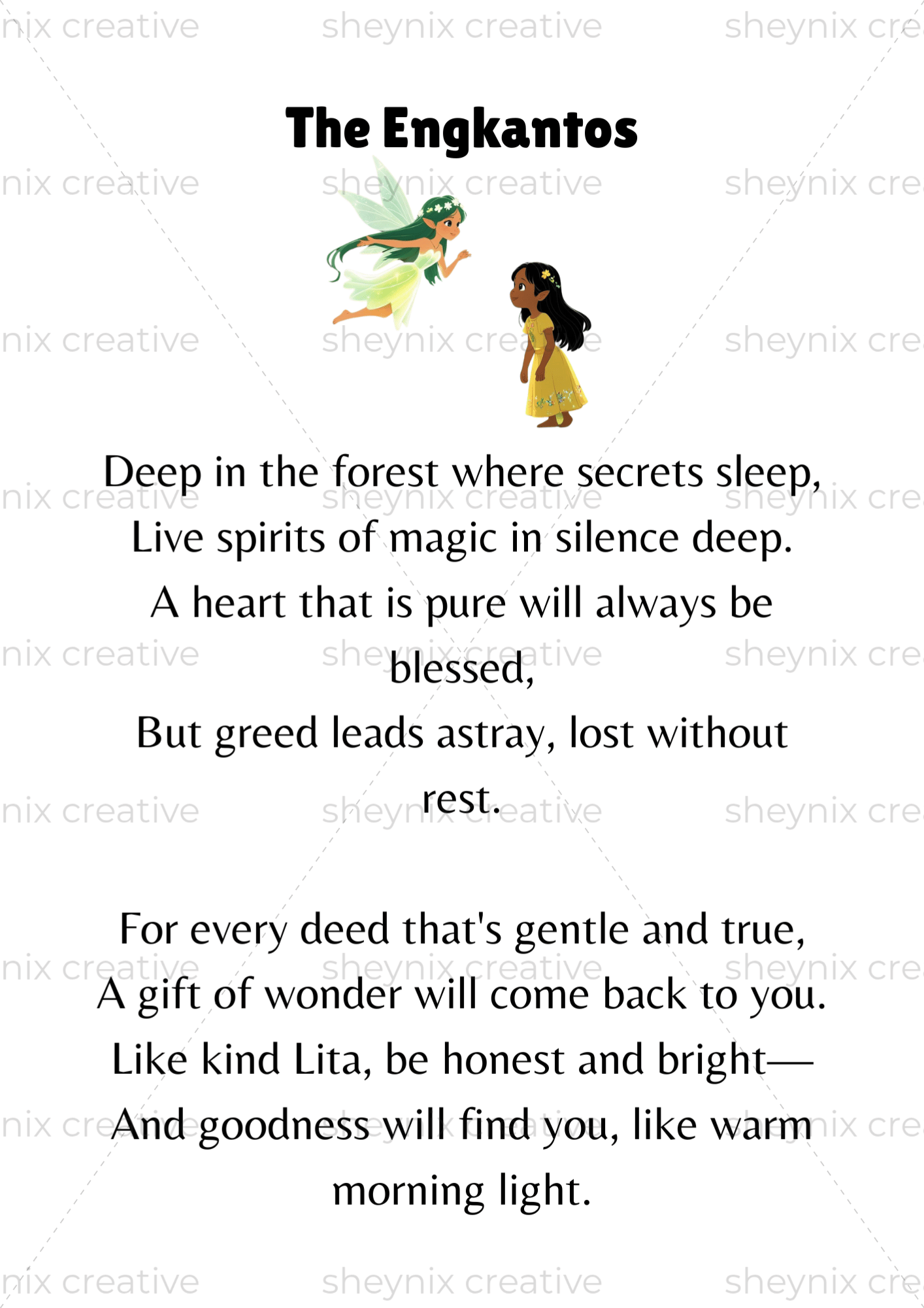 When Lita ventures into the enchanted forest to help her sick father, a simple act of kindness leads to a magical gift. But greed has no place among the engkanto—and those with selfish hearts may never find their way out again.