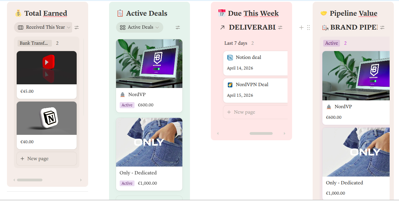 💰 Rate Card & Earnings — your pricing tiers, a negotiation principles block, and a live earnings summary. The page that makes you feel like a business.