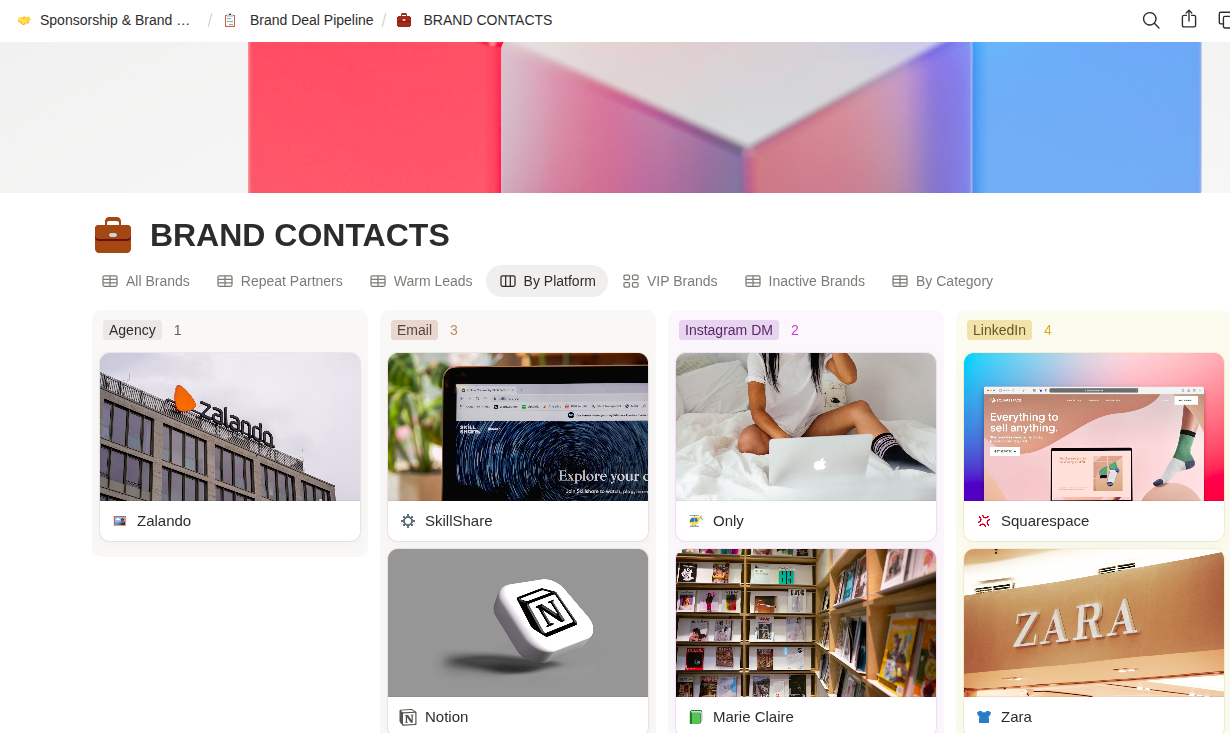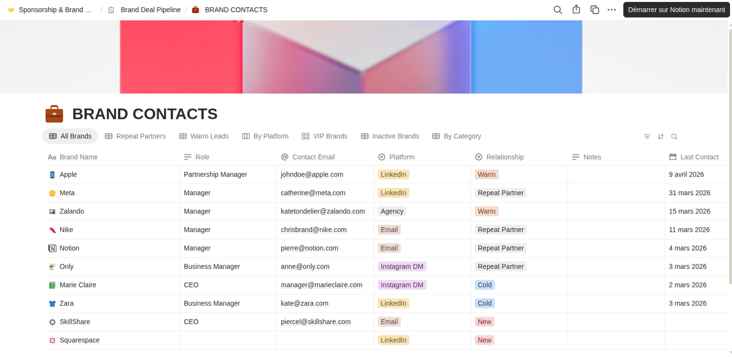 🏢 Brand Directory — one row per company. Tracks total earned per brand, average deal size, relationship status, and contact history.