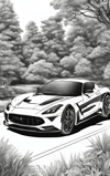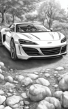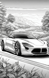 Digital render concept art coloring pages, depicting sports cars in rural environments.