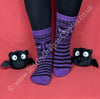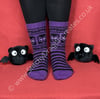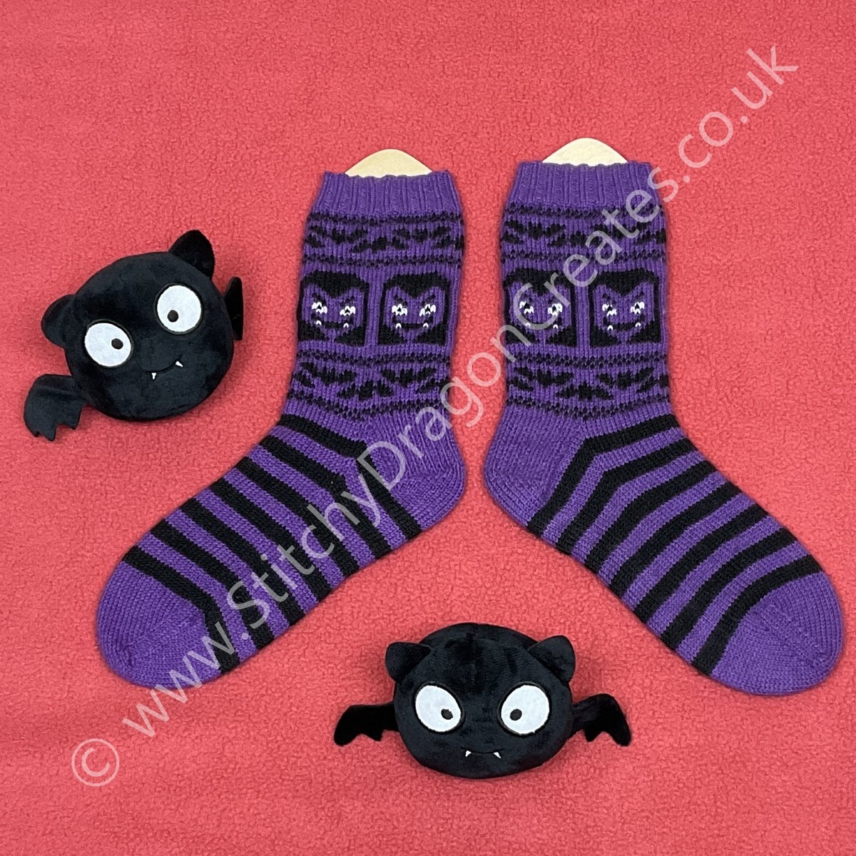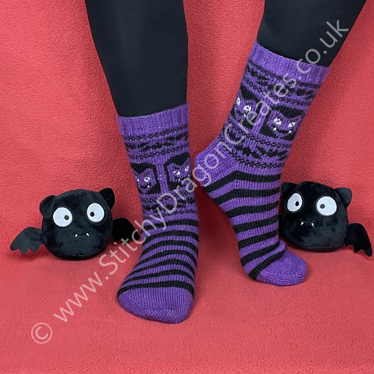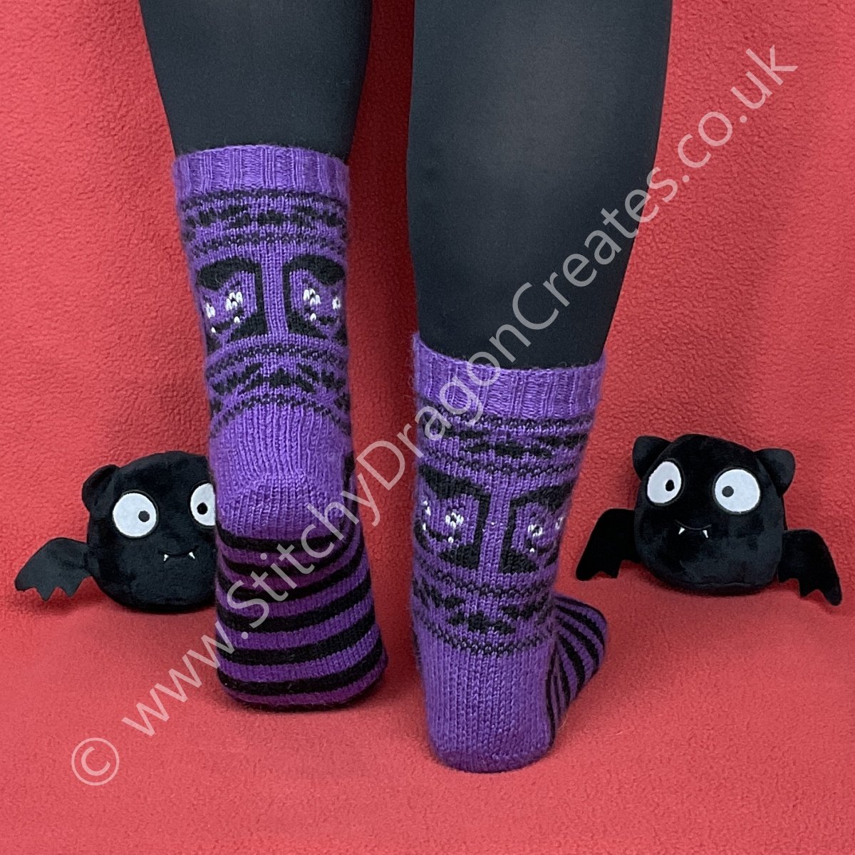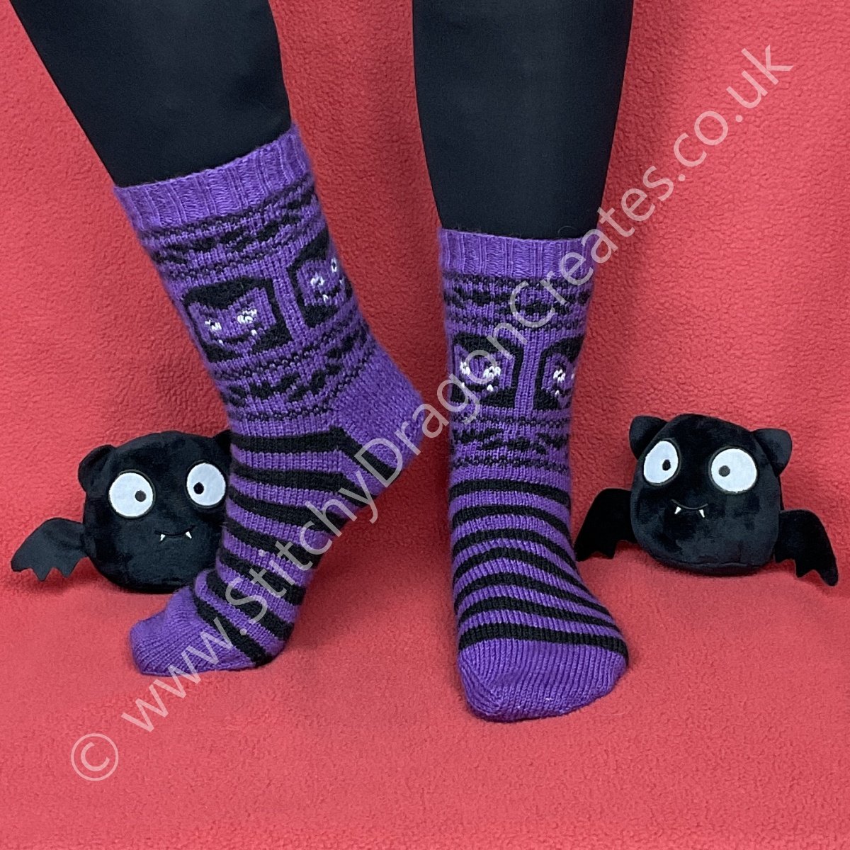 This pattern works well with three (or more) solid colors. You will only need a small amount of CC2 to add the details on Vlad’s face. The amounts of the other colors required will depend on how many colors you pick, where you choose to use them in the sock, and which size you are knitting. As a guide for the pair pictured (size M in three colors) I used the following quantities of Cygnet Truly Wool Rich 4 ply: