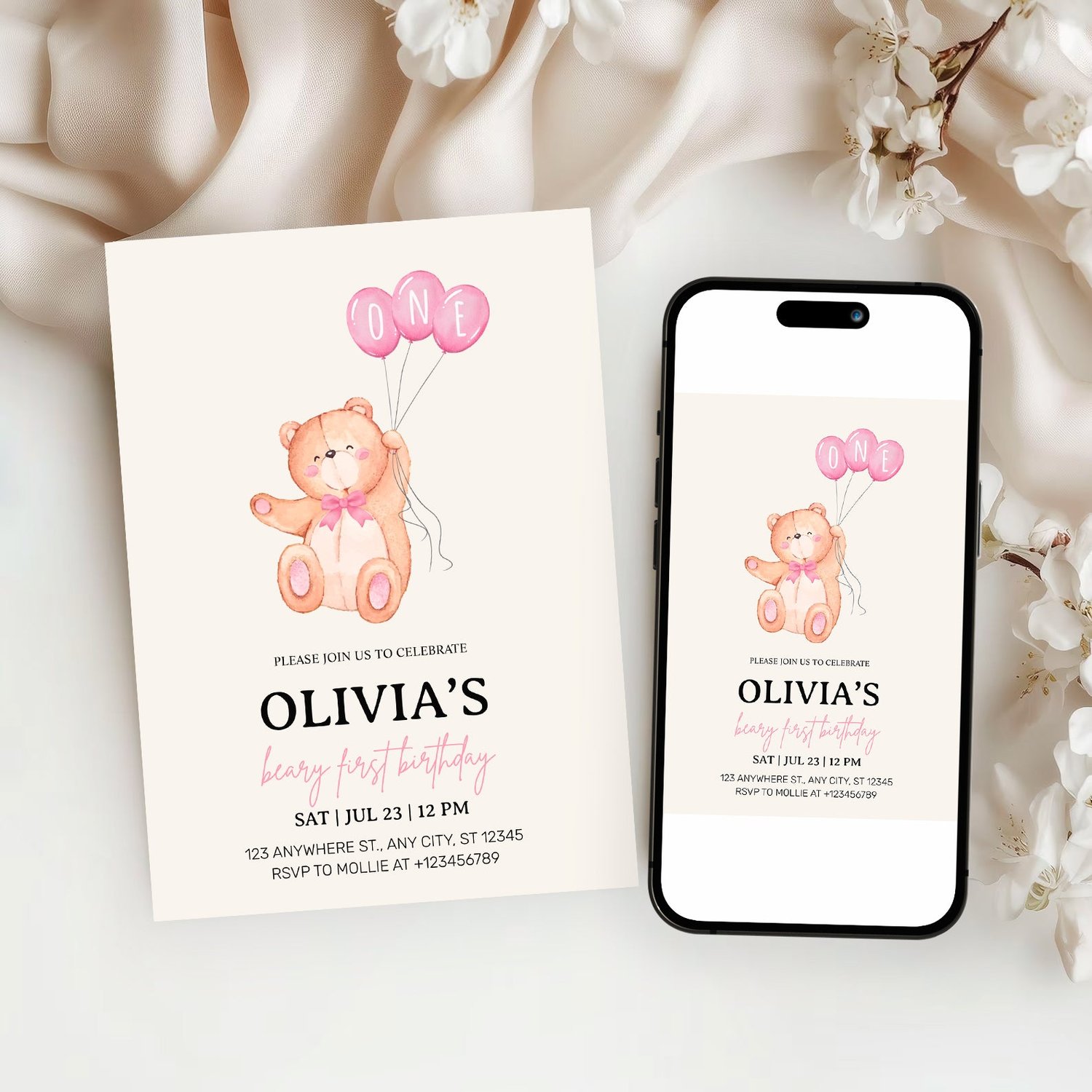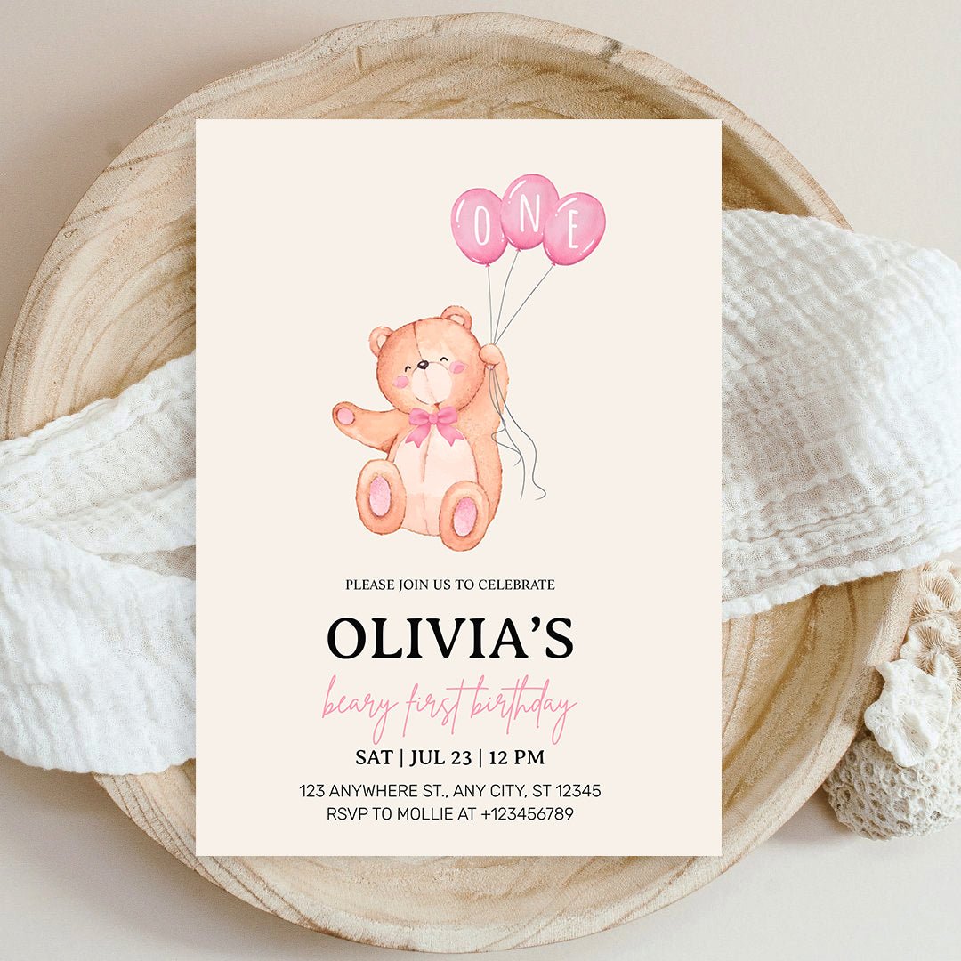 Beary First Pink Balloon 1st Birthday Teddy Invitation – Editable Canva Template