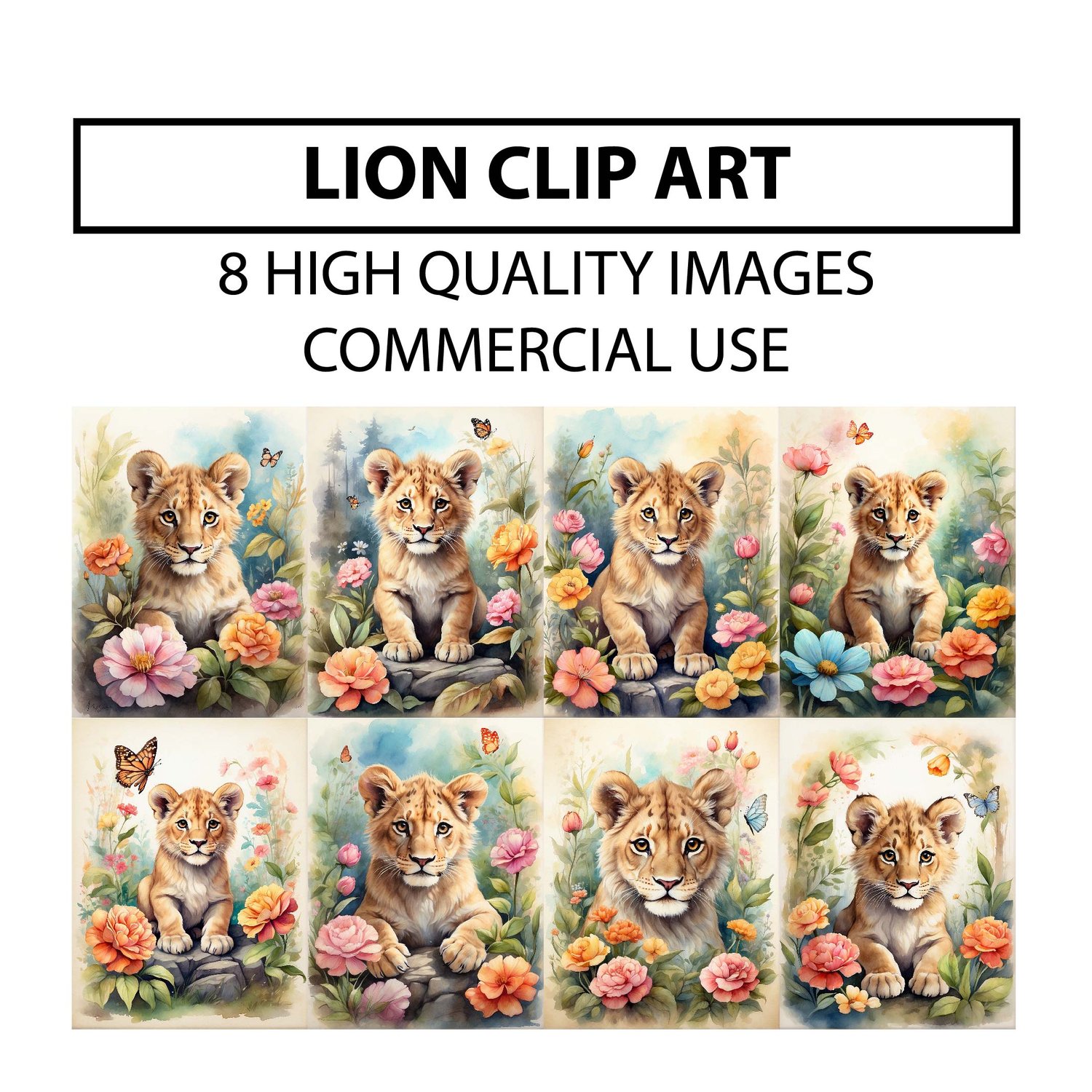 Lion Clip Art Designs - 8 High-Quality JPGs Bundle, Watercolor Digital Prints, Wall Art, Commercial Use