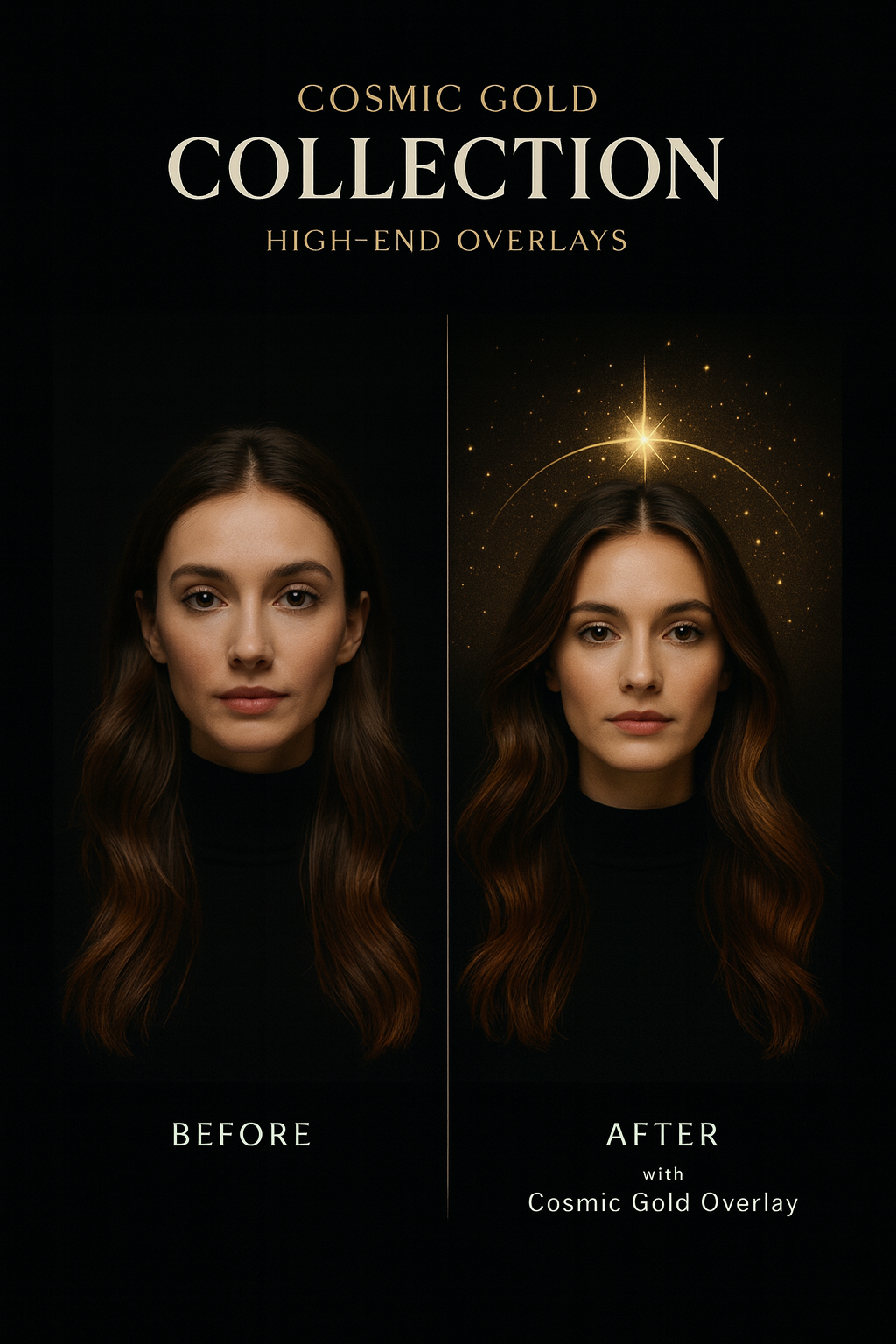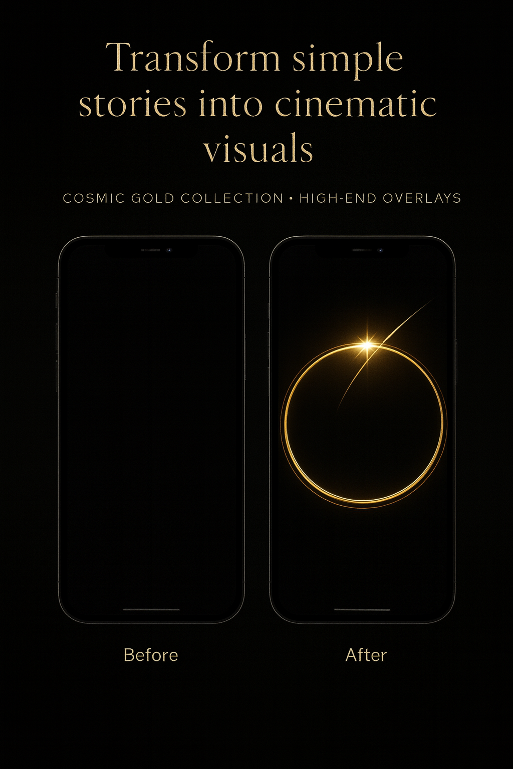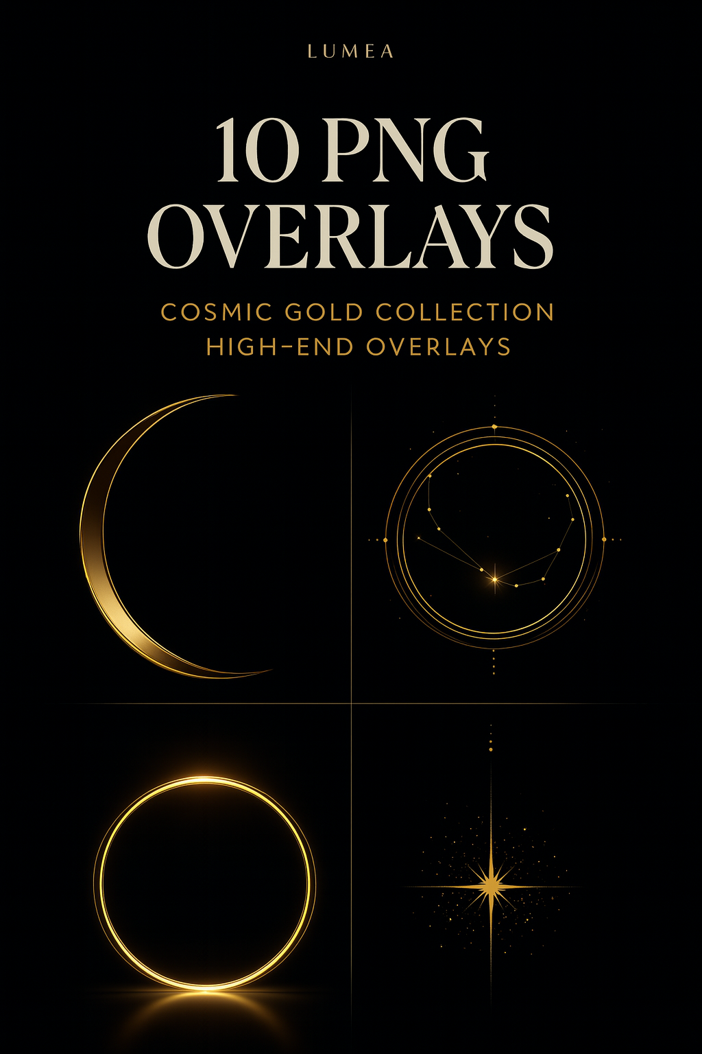 Elevate your visuals with this premium set of 10 cosmic golden-on-black overlays — clean, minimal line art with a soft, cinematic glow.