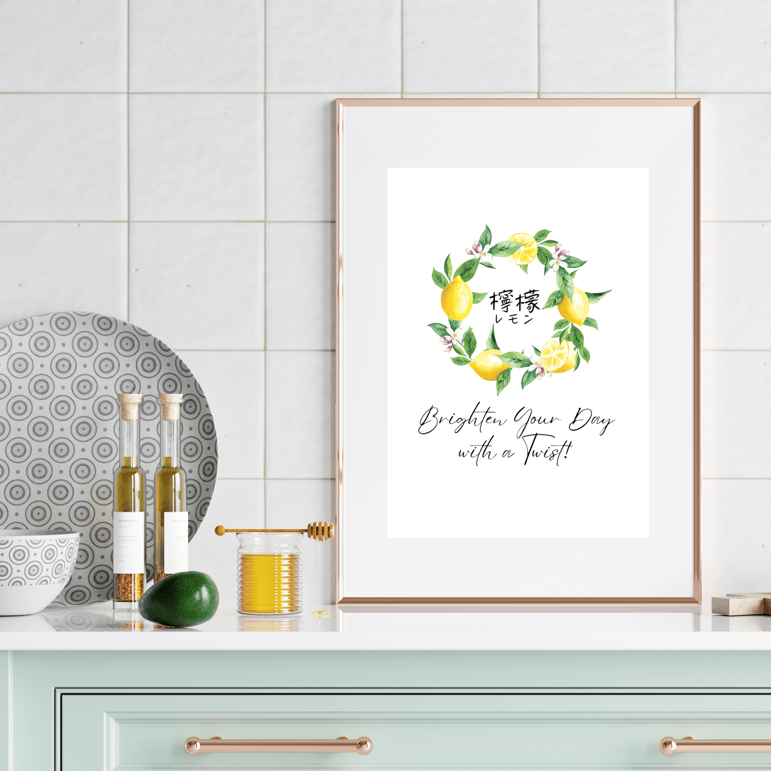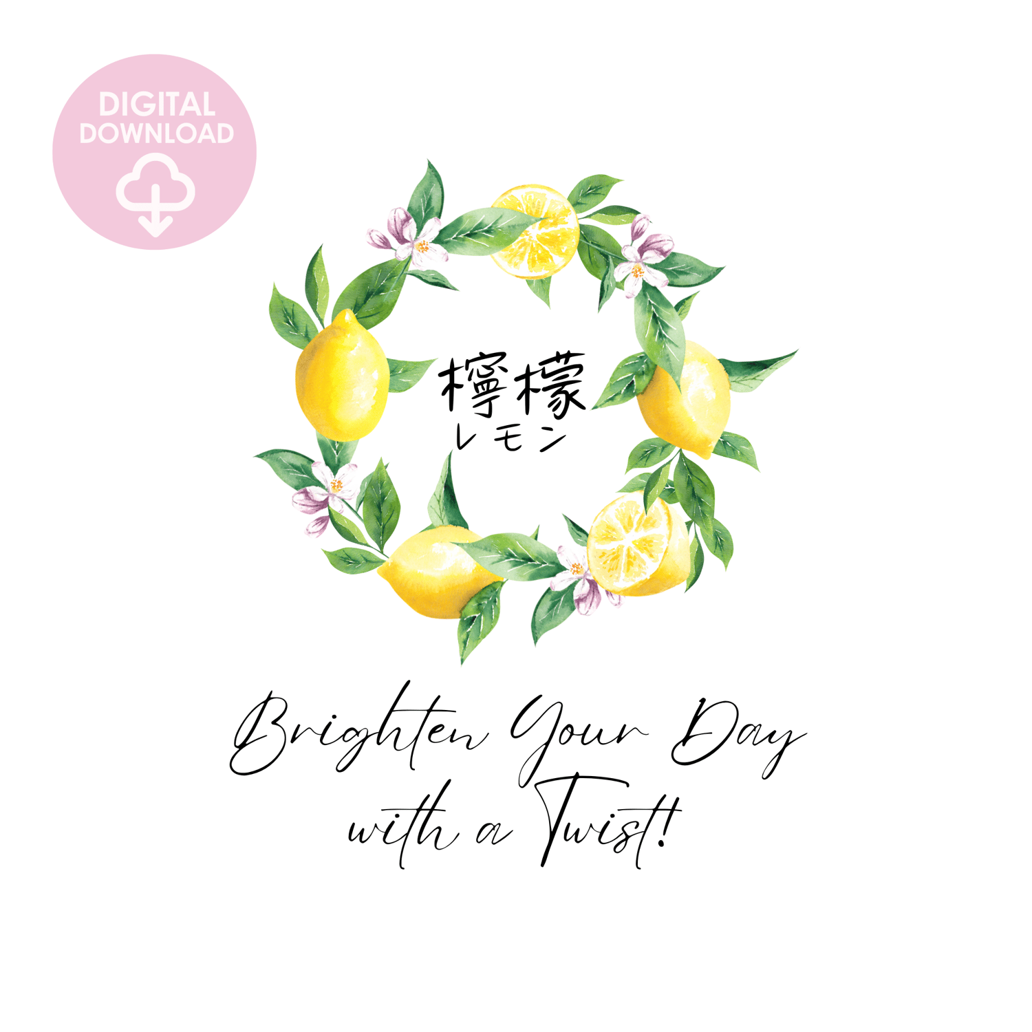 Discover my lemon watercolor wall art designed to brighten your kitchen and mornings. This printable artwork features a wreath of lemons with the word "lemon" in both Kanji and Katakana, symbolizing a fresh and vibrant start to the day. It's perfect for anyone who believes the day begins in the kitchen.