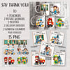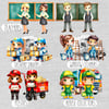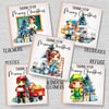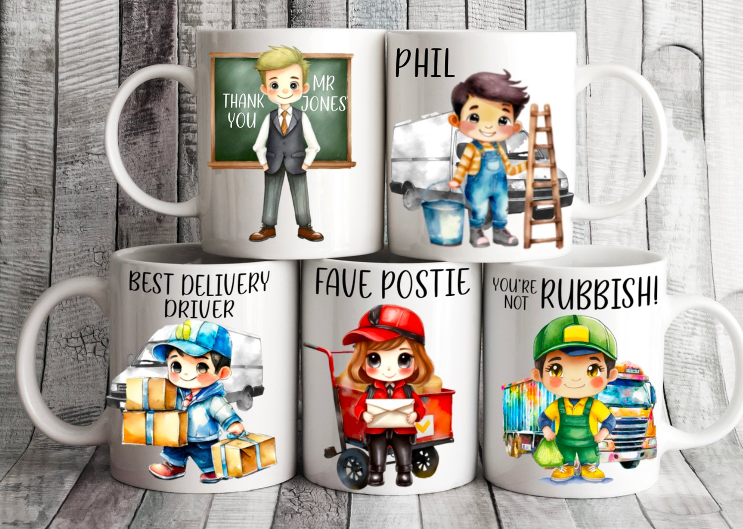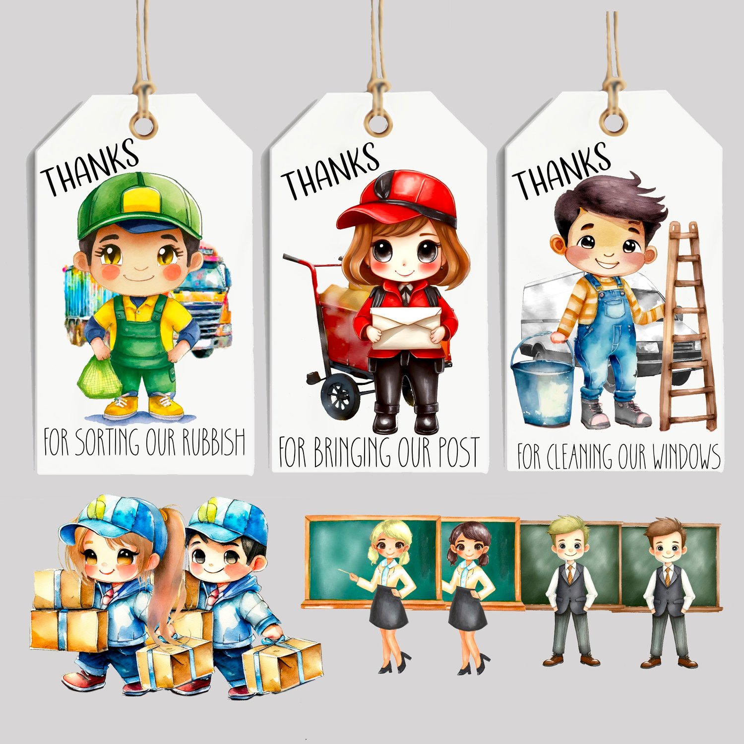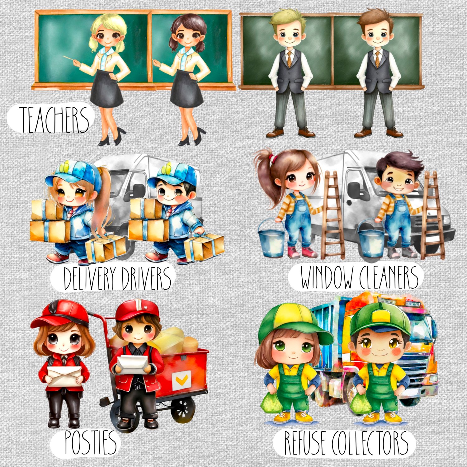 Professions; 4 teachers, 2 delivery drivers, 2 refuse collectors, 2 post delivery, 2 window cleaners, plus vehicles. 15 PNGs. Ideal for thank you cards, Christmas bonus etc. Sublimation, print