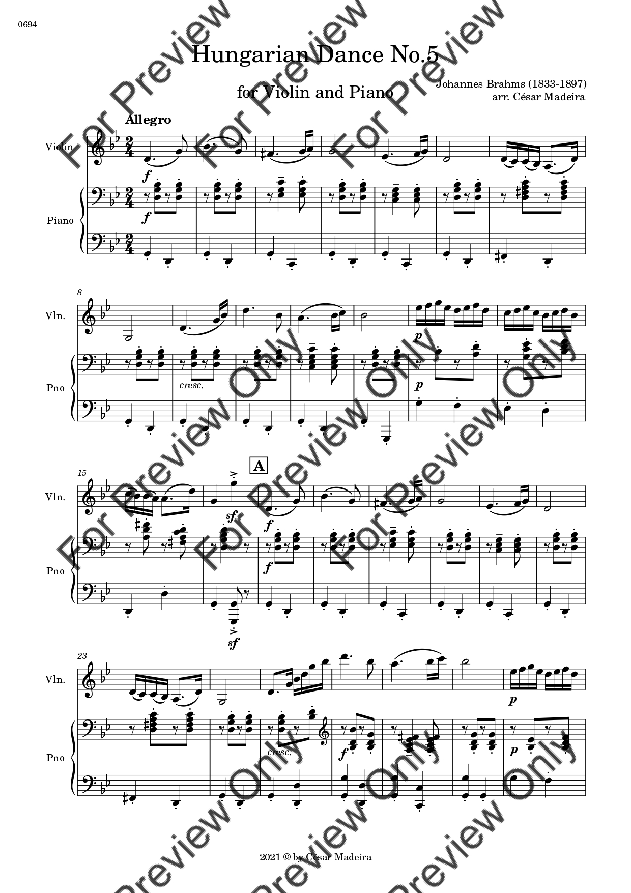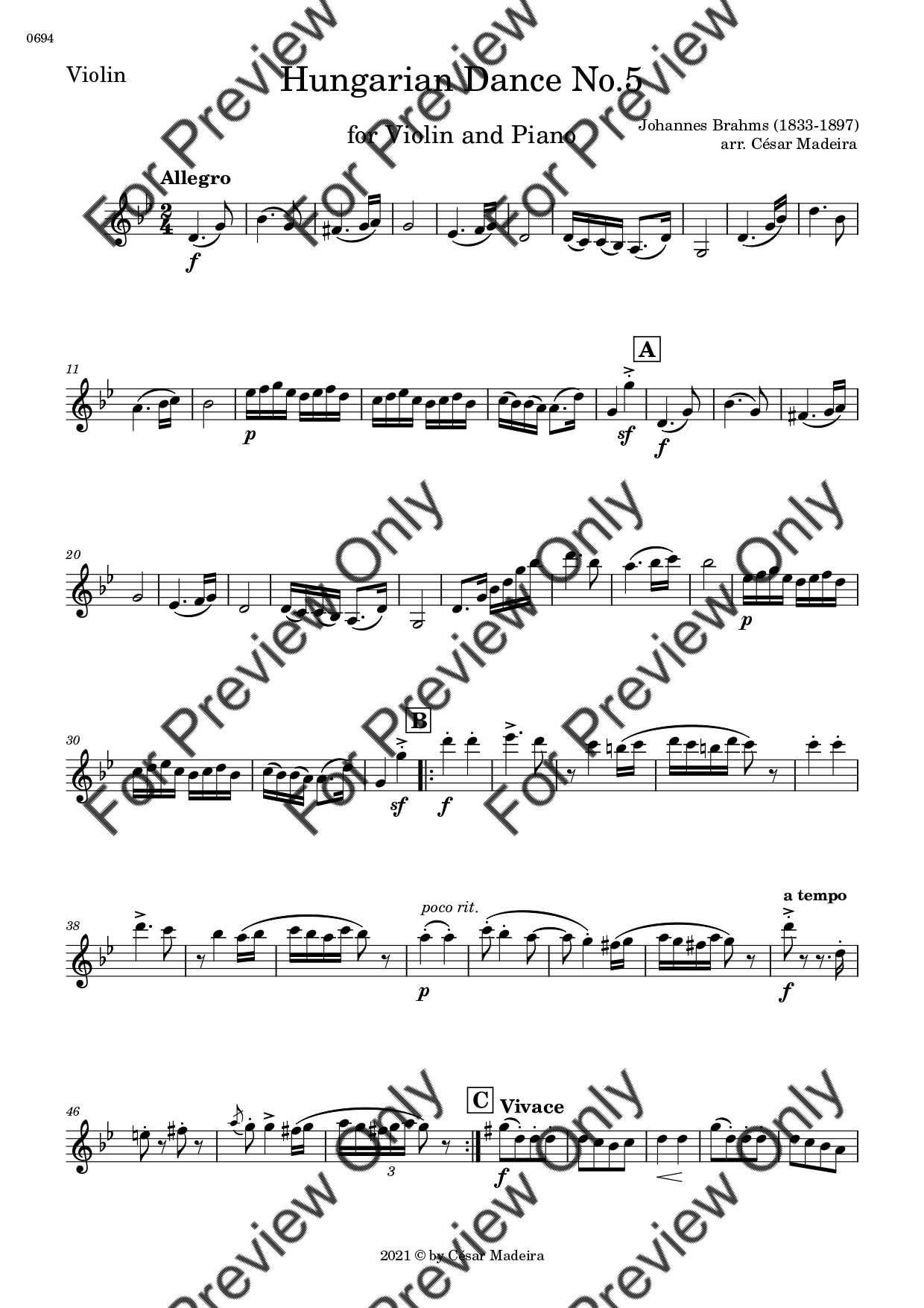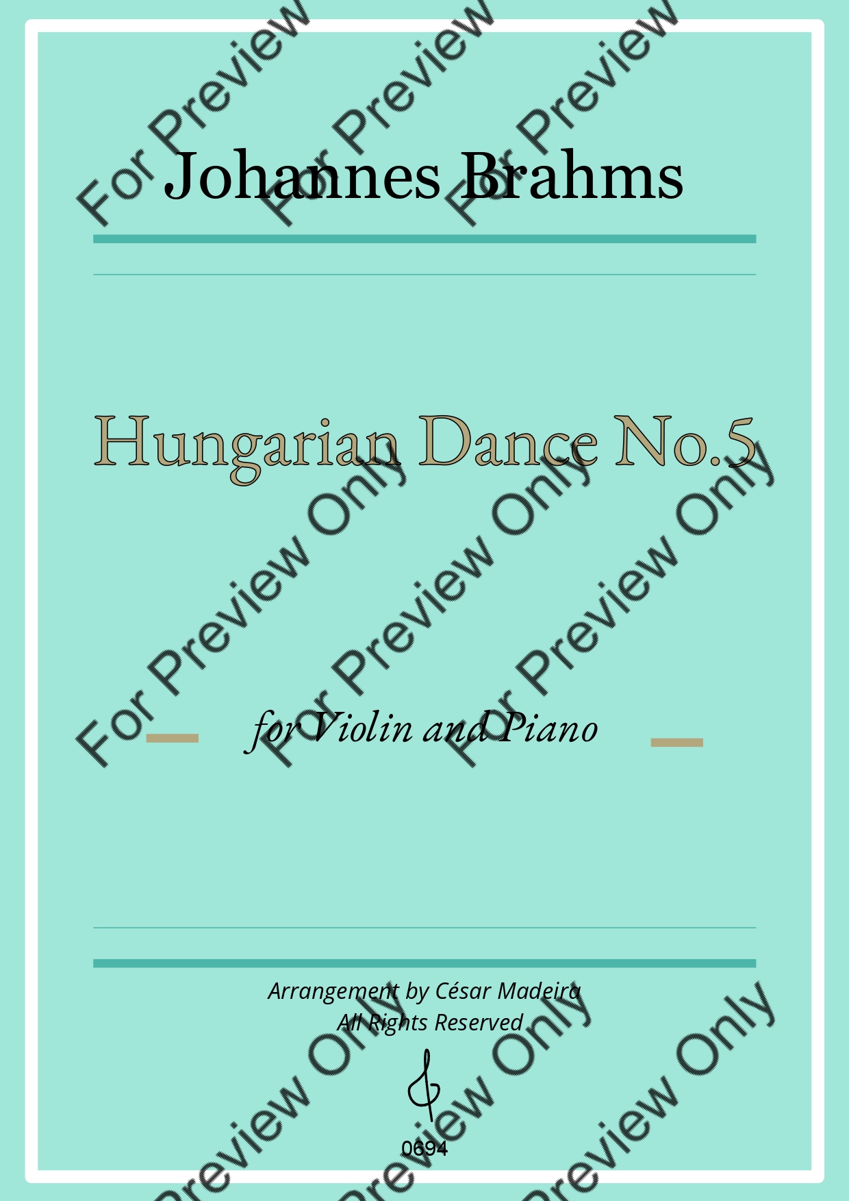 Hungarian Dance No.5 by Johannes Brahms. Arrangement for Violin and Piano. With Full Score and Individual Parts. Have fun!