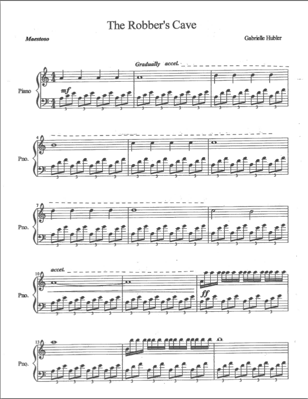 Piano sheet music for "The Robber's Cave" by Gabrielle Hubler of http://www.knitsnnotes.wordpress.com. Twelve pages.