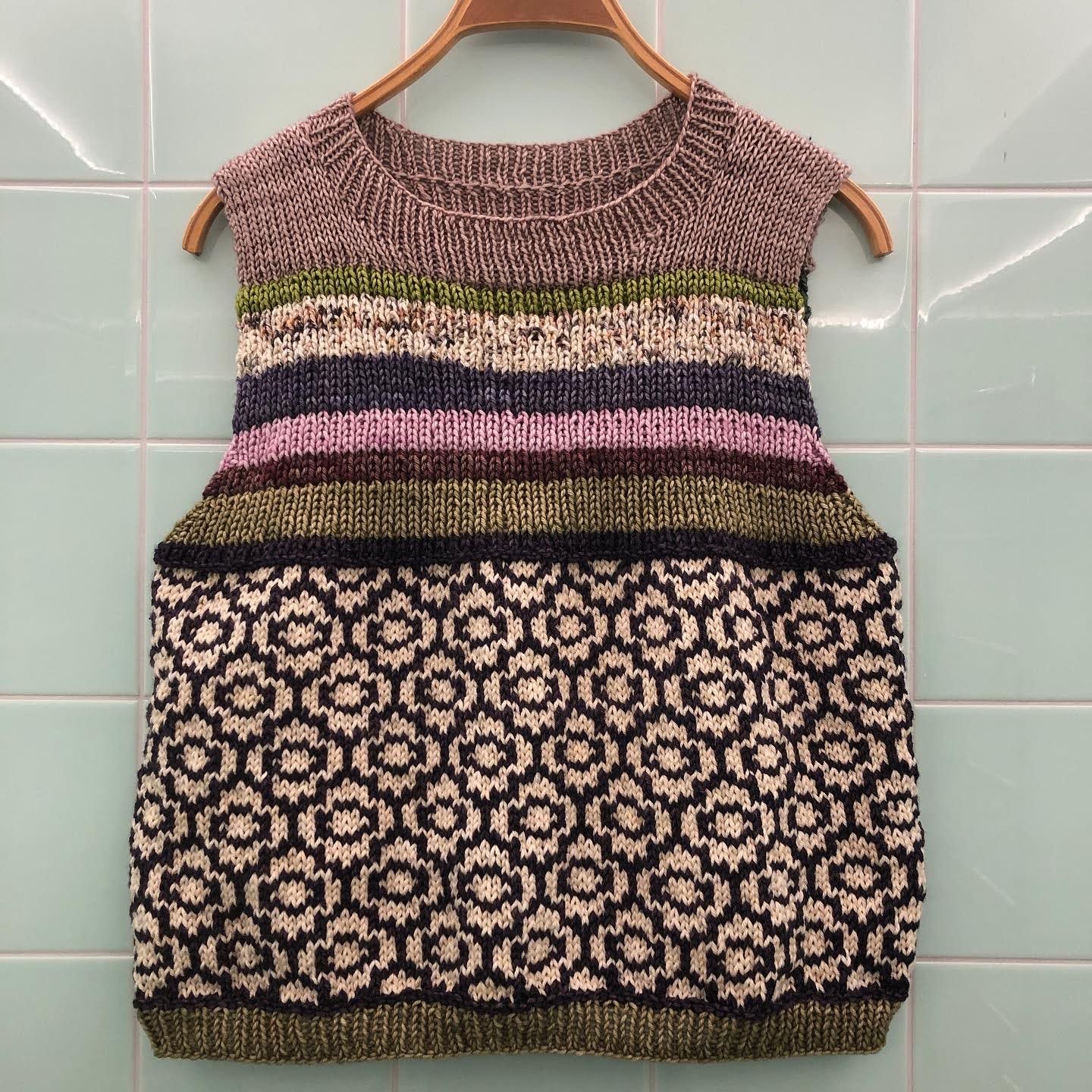 This vest is started at the shoulders and then front and back are worked flat in ribbed stripes. After striped sections are done they are joined in the round and knitted (stranded) colorwork entails. The vest fits fairly snuggly over the bust and is loose-fit over tummy and hips.