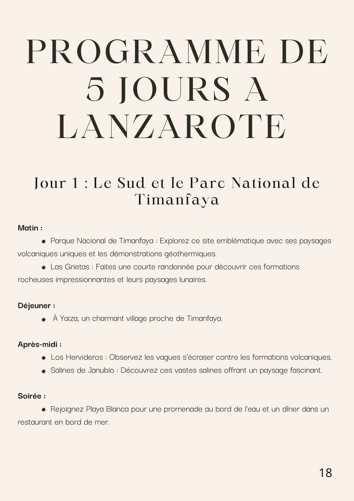 « Lanzarote : Guide des Activités Incontournables » est un ouvrage destiné à guider les voyageurs à travers les merveilles naturelles, culturelles et historiques de l’île de Lanzarote, l’une des destinations les plus fascinantes des Canaries. Le livre propose une sélection d’activités et de lieux à ne pas manquer, tout en mettant en avant les caractéristiques uniques de l’île.