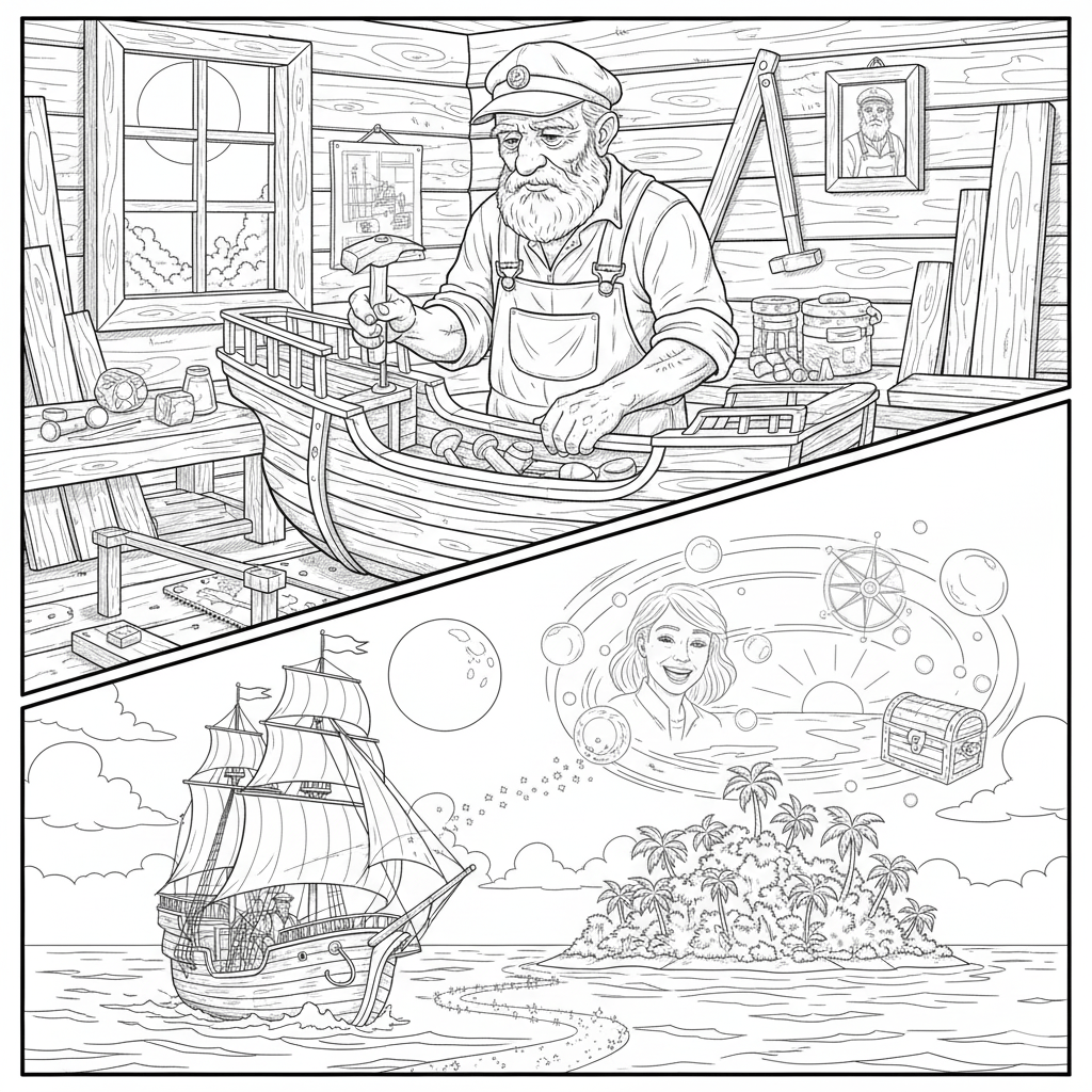 The Old Man and the Sea" – a story-based coloring book. Follow an old sailor's poignant voyage through 14 intricate illustrations, exploring islands of lost memory. This meditative journey blends detailed ships, dreamscapes, and symbolic landscapes into a single, continuous narrative about life, reflection, and hope. Perfect for mindful creativity