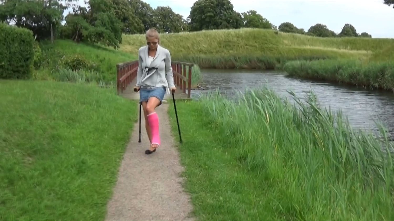 Ice comes crutch over a bridge with her pink term SLC on her left leg. She is today wearing a white cardigan and a blue denim skirt that allows us to see her SLC without any problems.Without warning, the weather gets worse and it blows up and it will soon start to rain.Ice now hurries back to the parking lot but it is not so easy to be fast on crutches and after a while she has to sit down to rest.