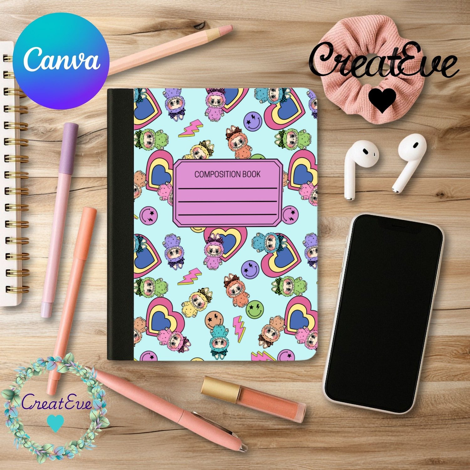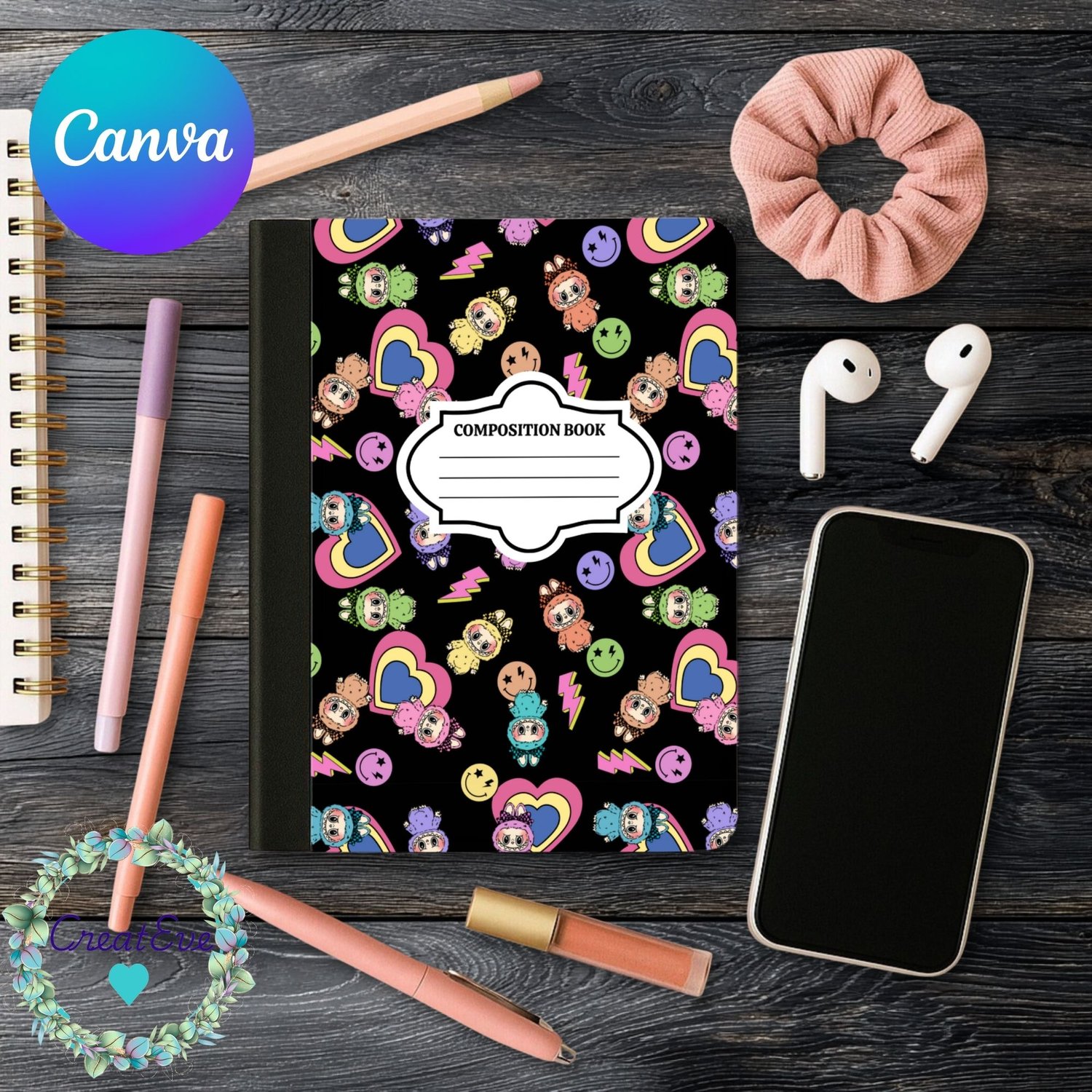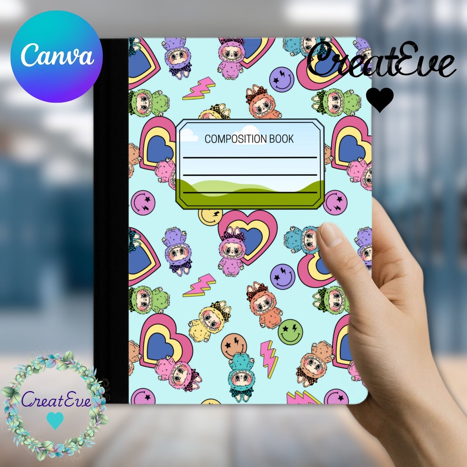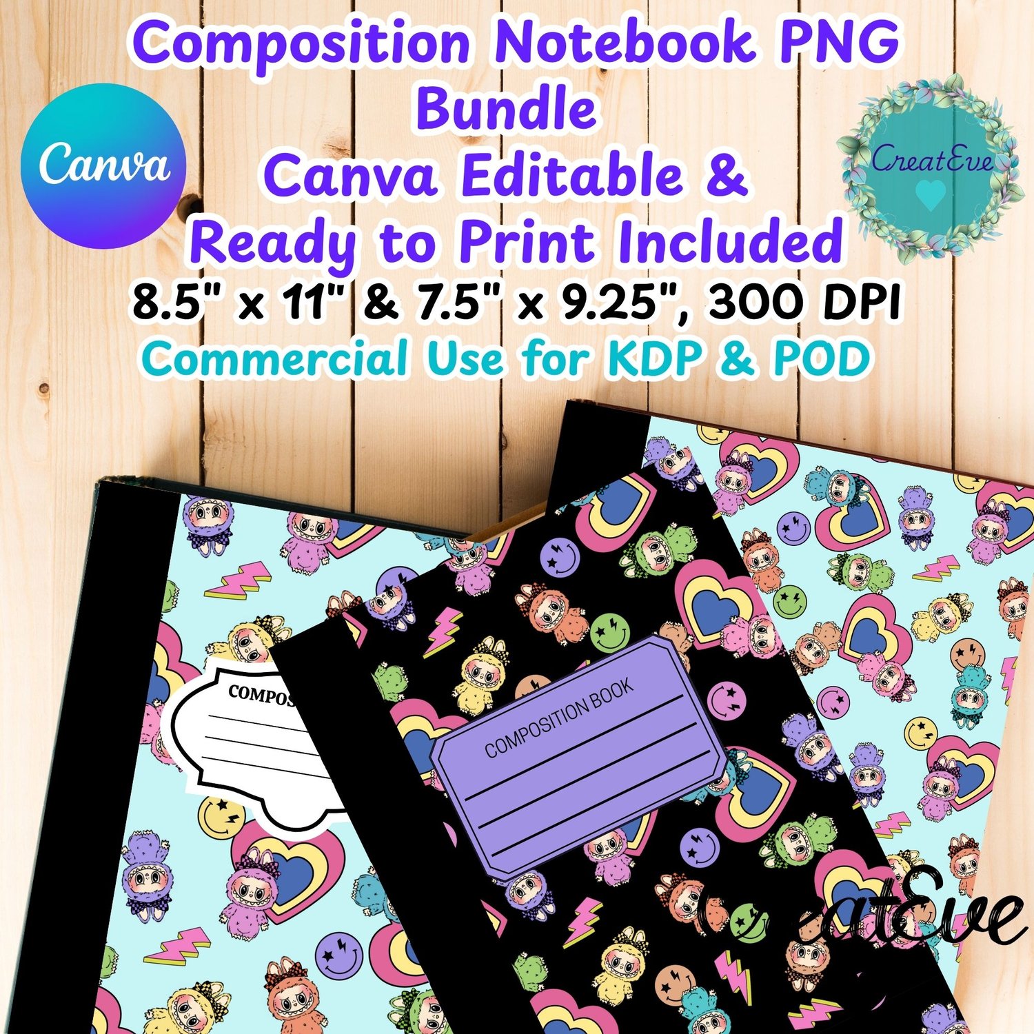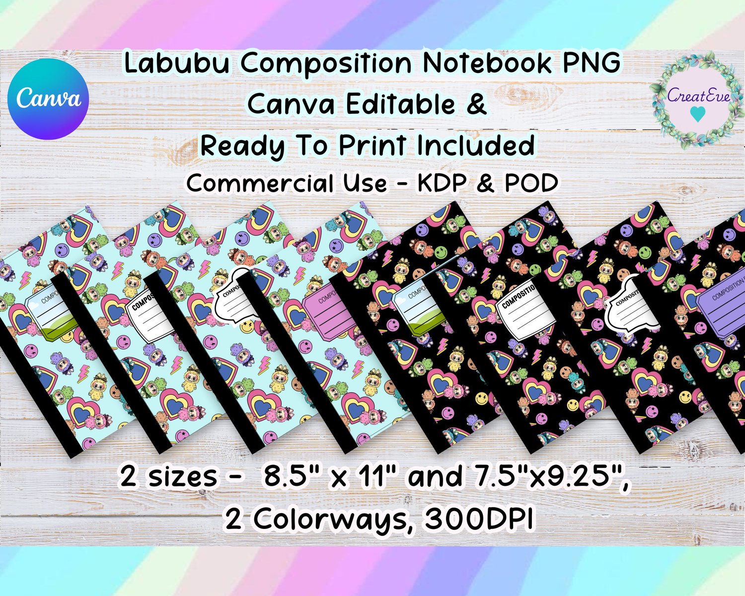 Hand Drawn Labubu Retro Vibe Composition Notebook 2 Colorway PNG Bundle Canva Editable AND Ready to Print,Commercial KDP Included