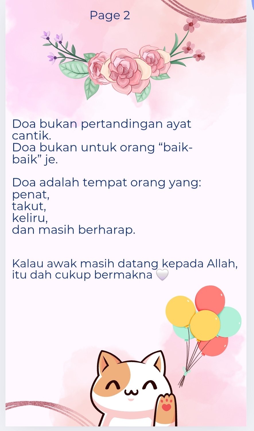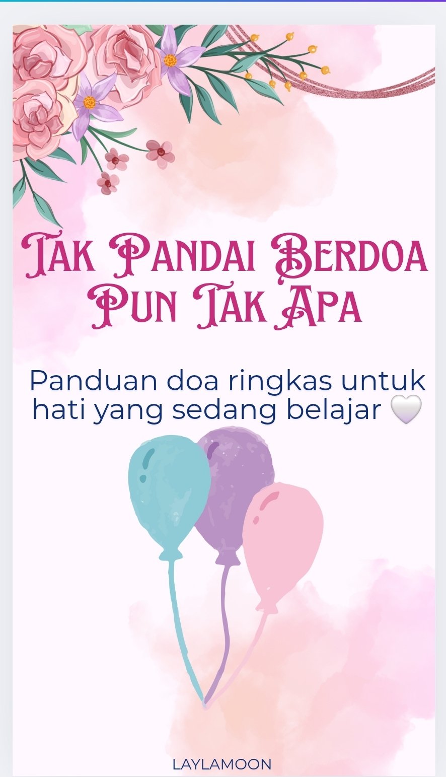 Dulu saya rasa susah nak berdoa… kadang nak mula pun tak tahu apa nak cakap. Tapi lepas saya ikut ebook ‘Tak Pandai Berdoa Tak Apa’, doa pendek & zikir mudah jadi sebahagian dari hari-hari saya. 🌸