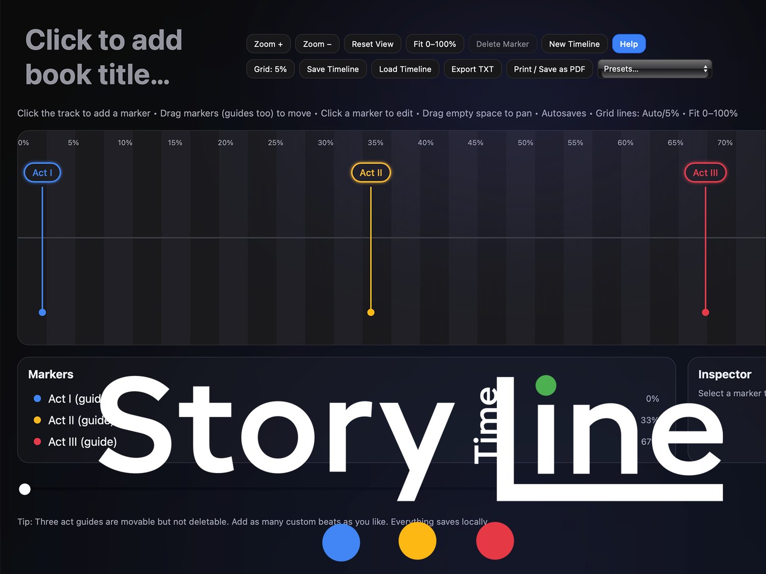 Save and load your projects, export and import timelines, and access all built-in presets like Hero’s Journey and Save the Cat.
