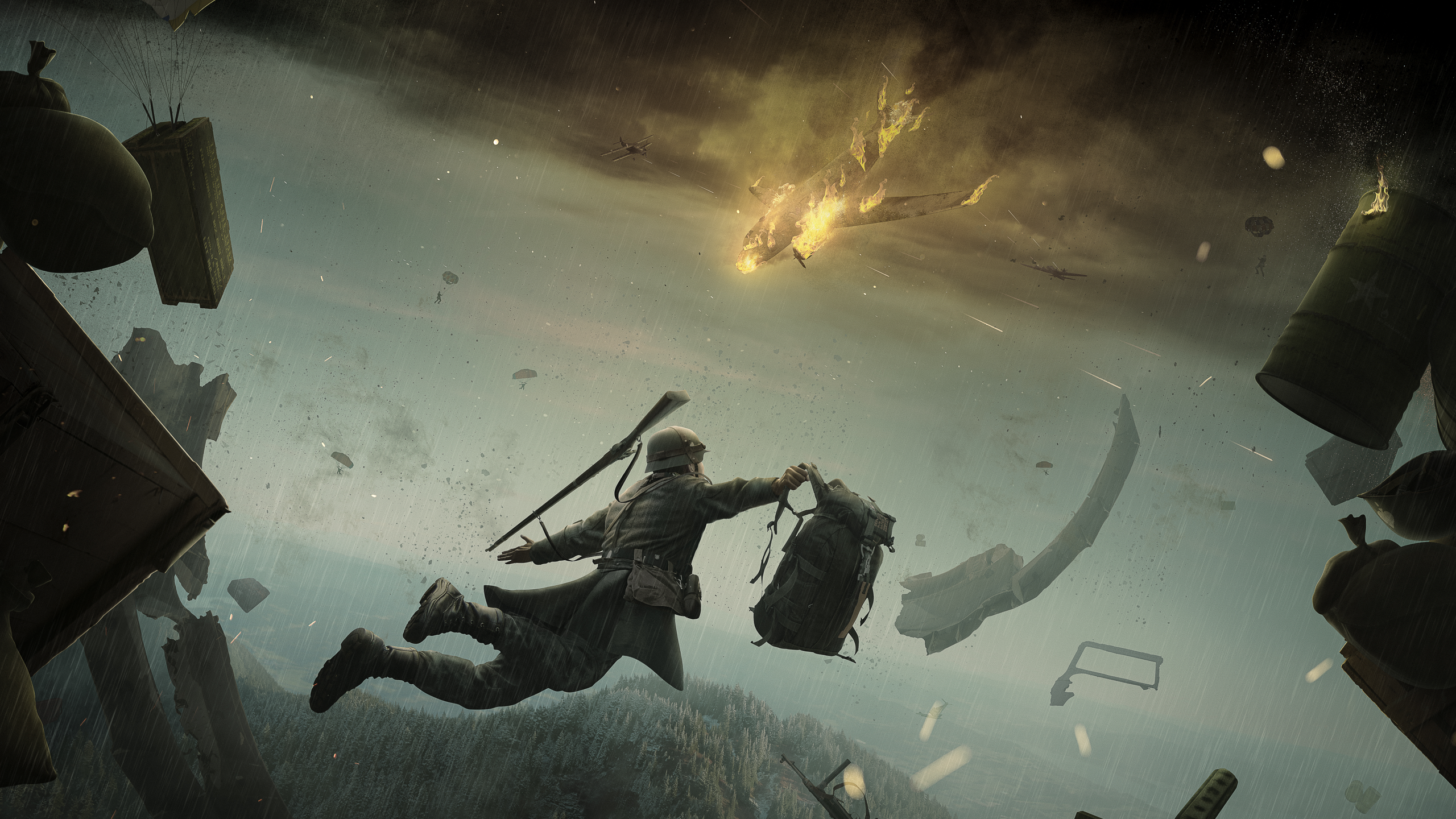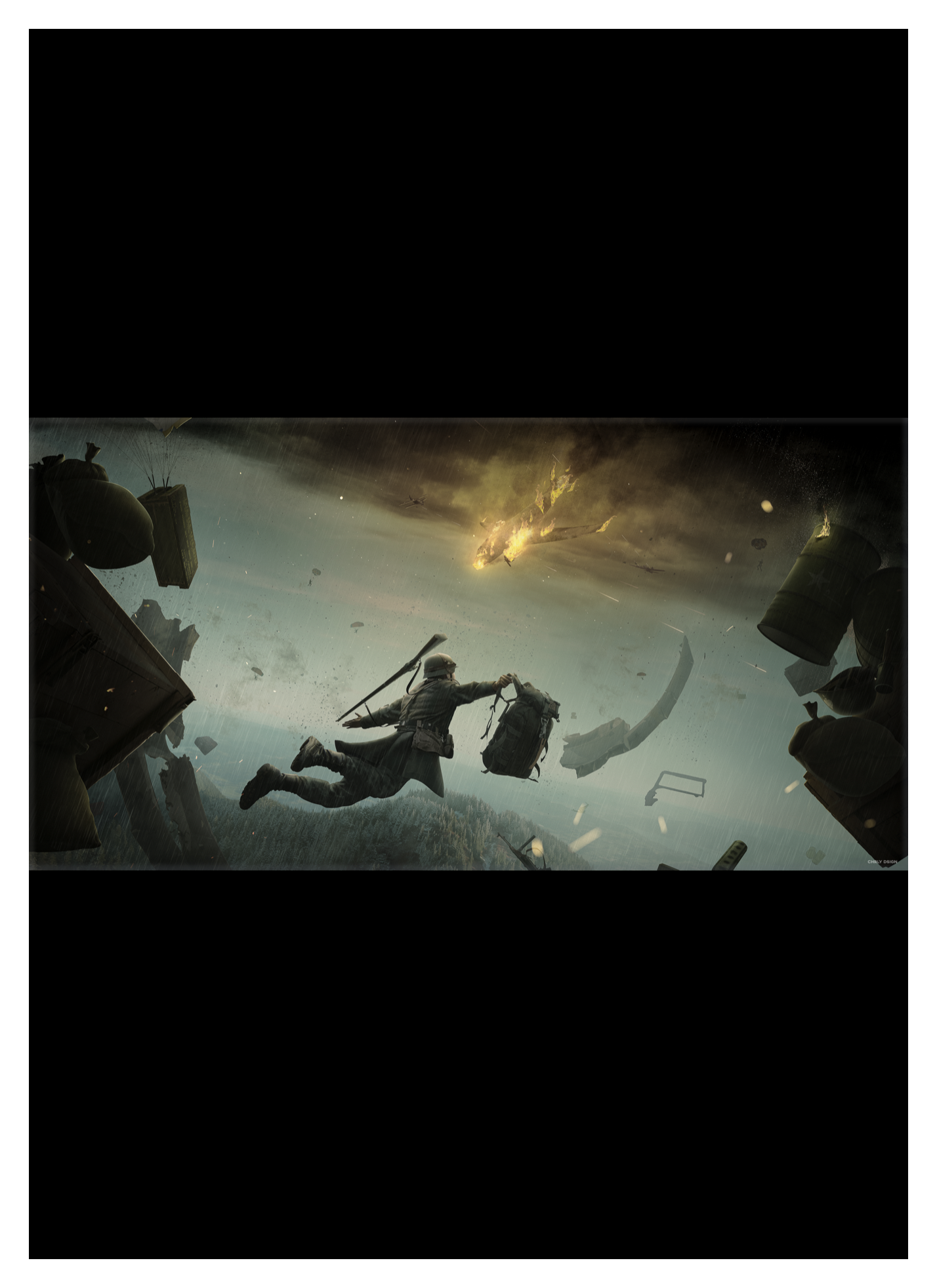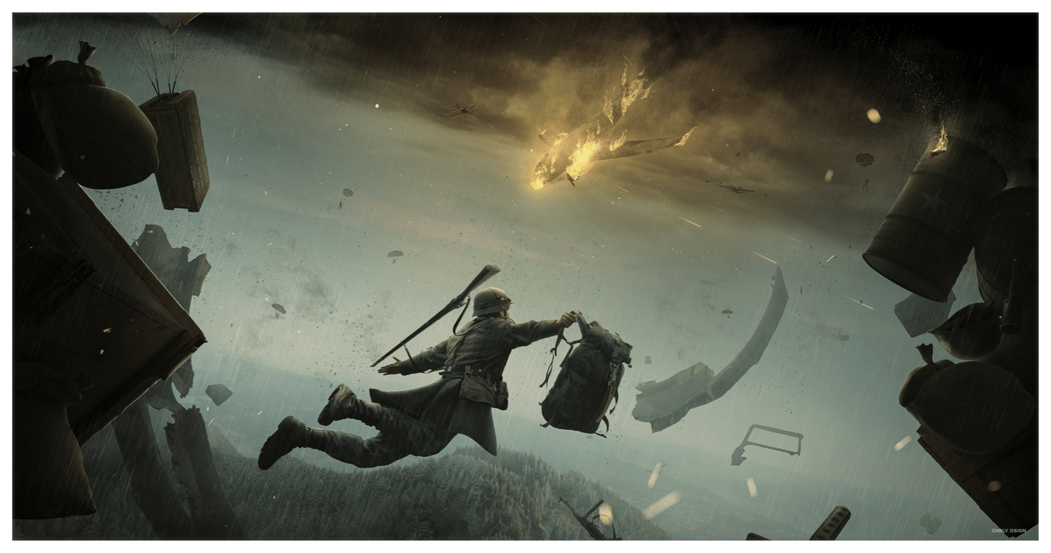 // WWII soldier free-falling after a plane crash in the middle of the war · Panoramic Poster by CHRLY DSIGN®