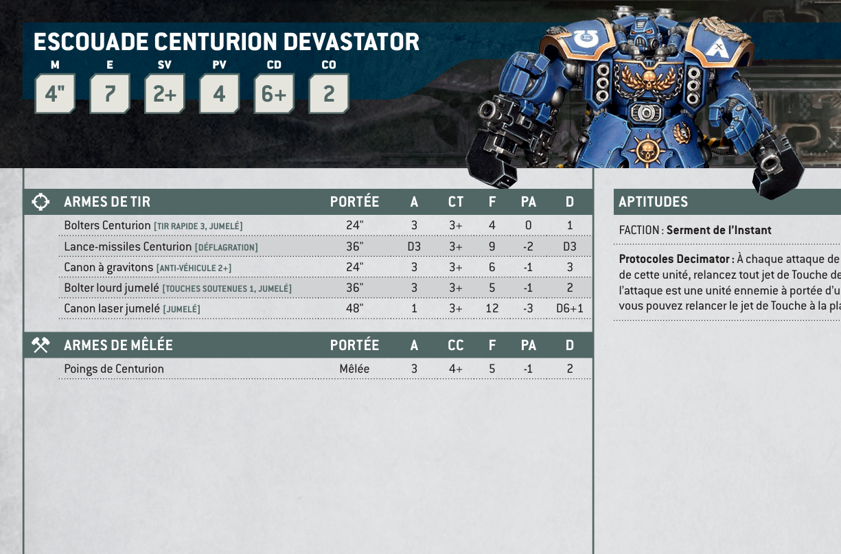 - Troupes : Intercessors, Infernus, Hellblasters, Scouts, Reivers, Bladeguards, Sternguards, Vanguards.