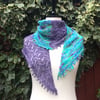 This shawl is a tale of two halves! One side is simple stockinette and is designed to work perfectly with a lovely variegated yarn, and the other side keeps things interesting with an easy repeat lace pattern in a contrasting solid or semi solid shade.